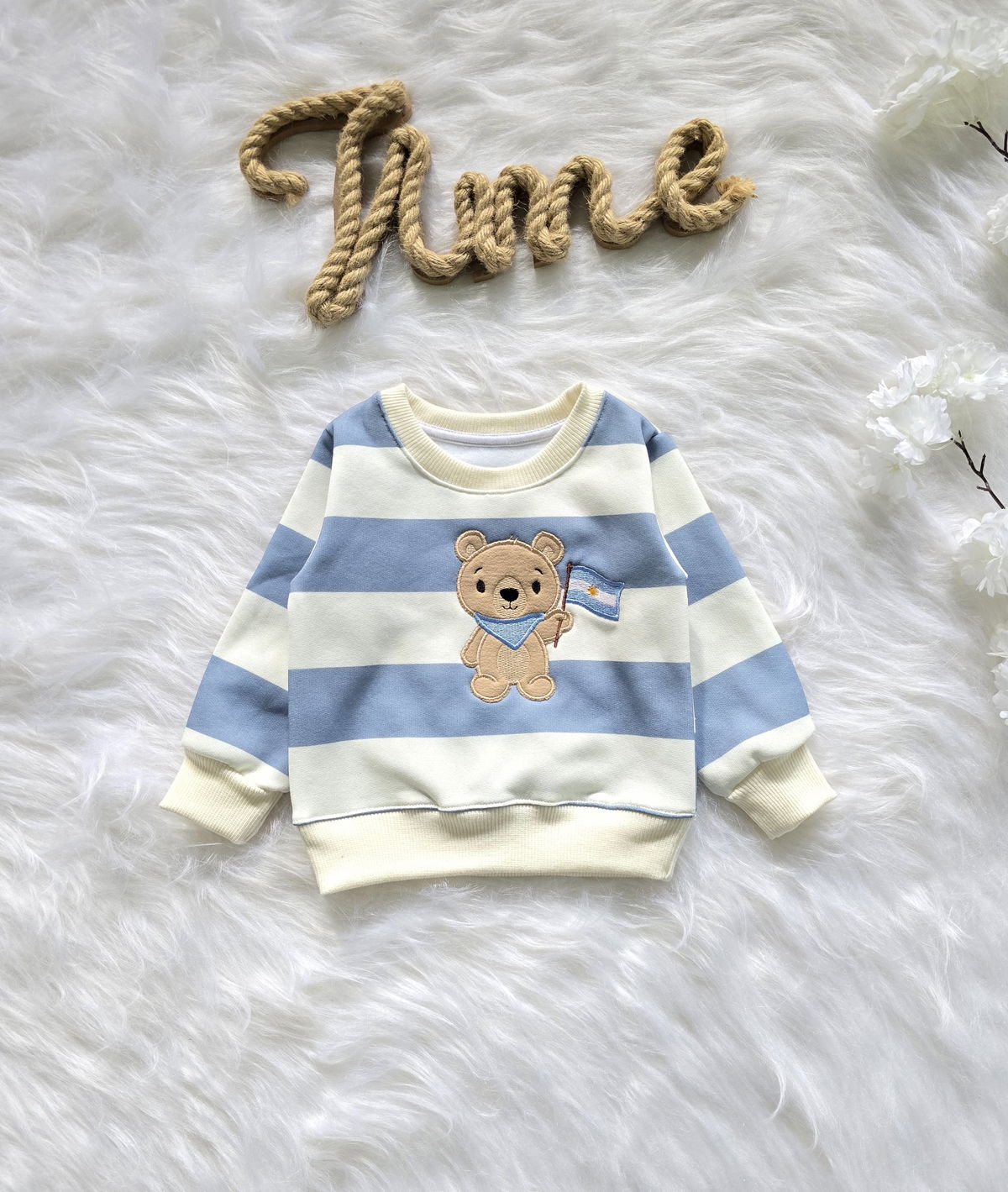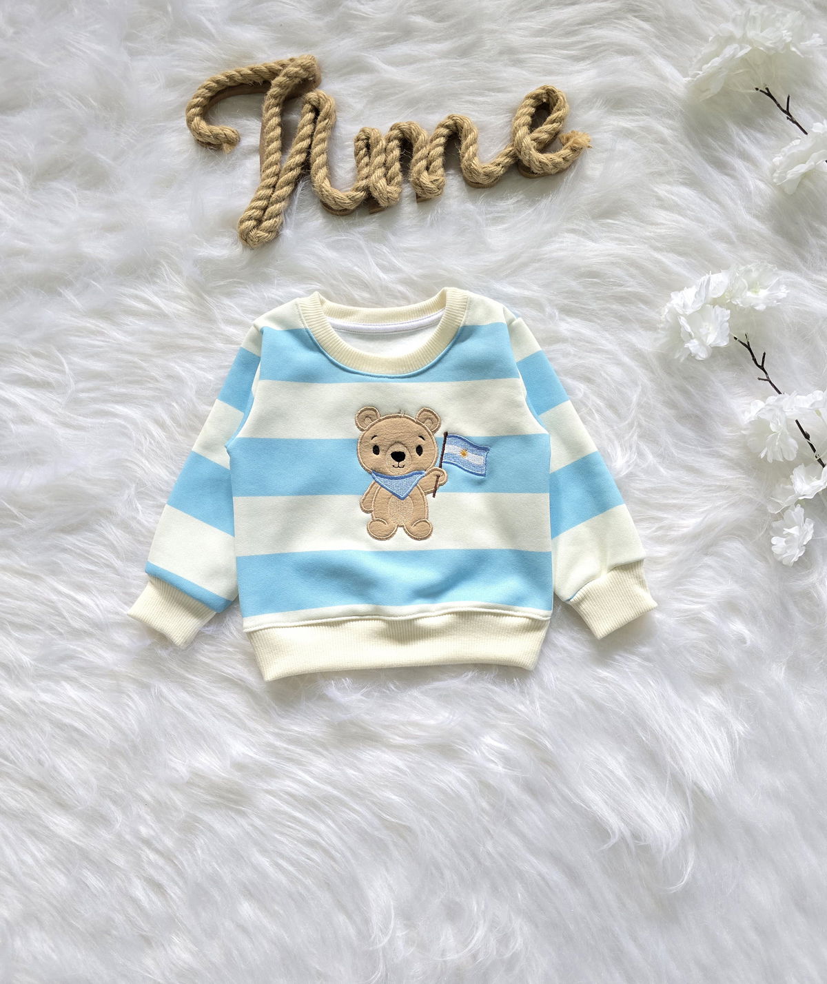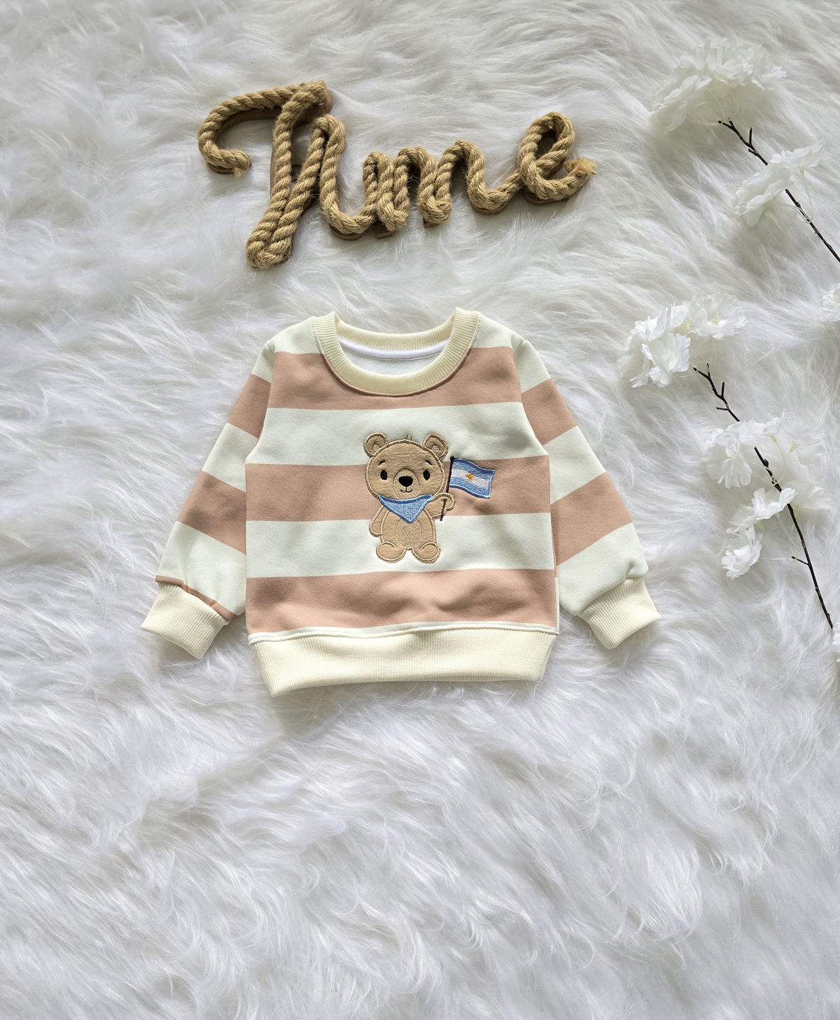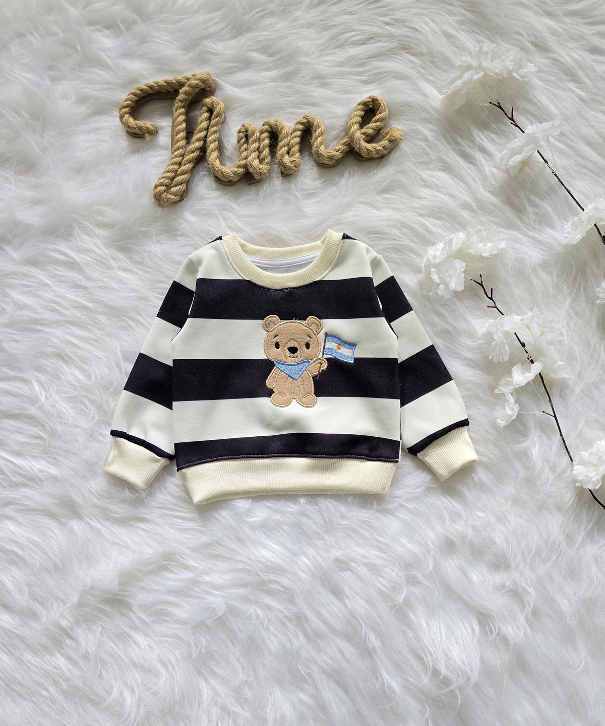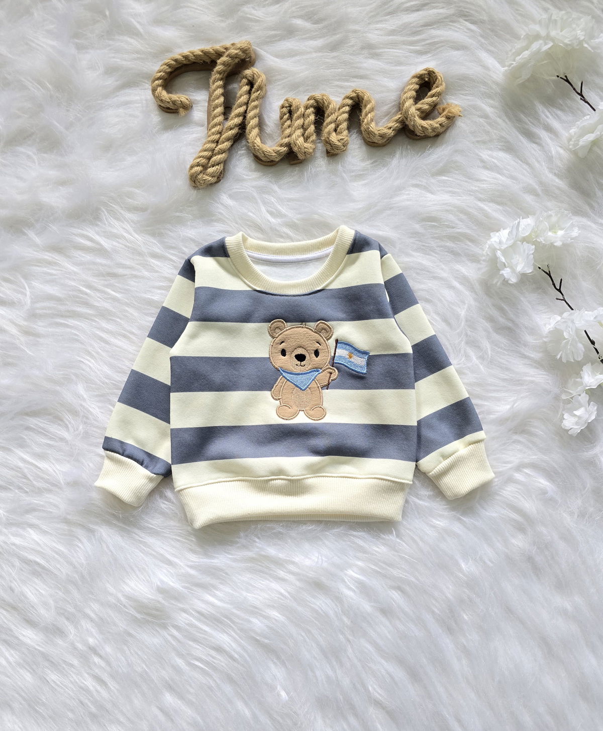 Diseño rayado con bordado de oso en el frente que le aporta un detalle tierno y diferencial.