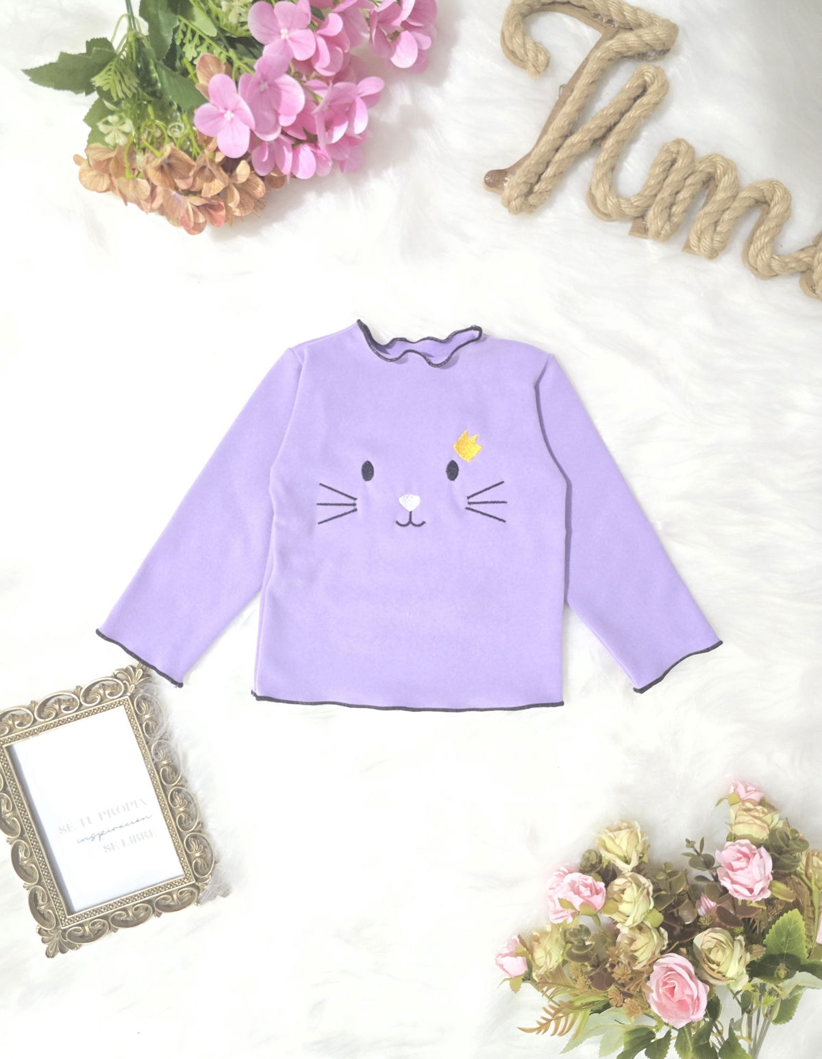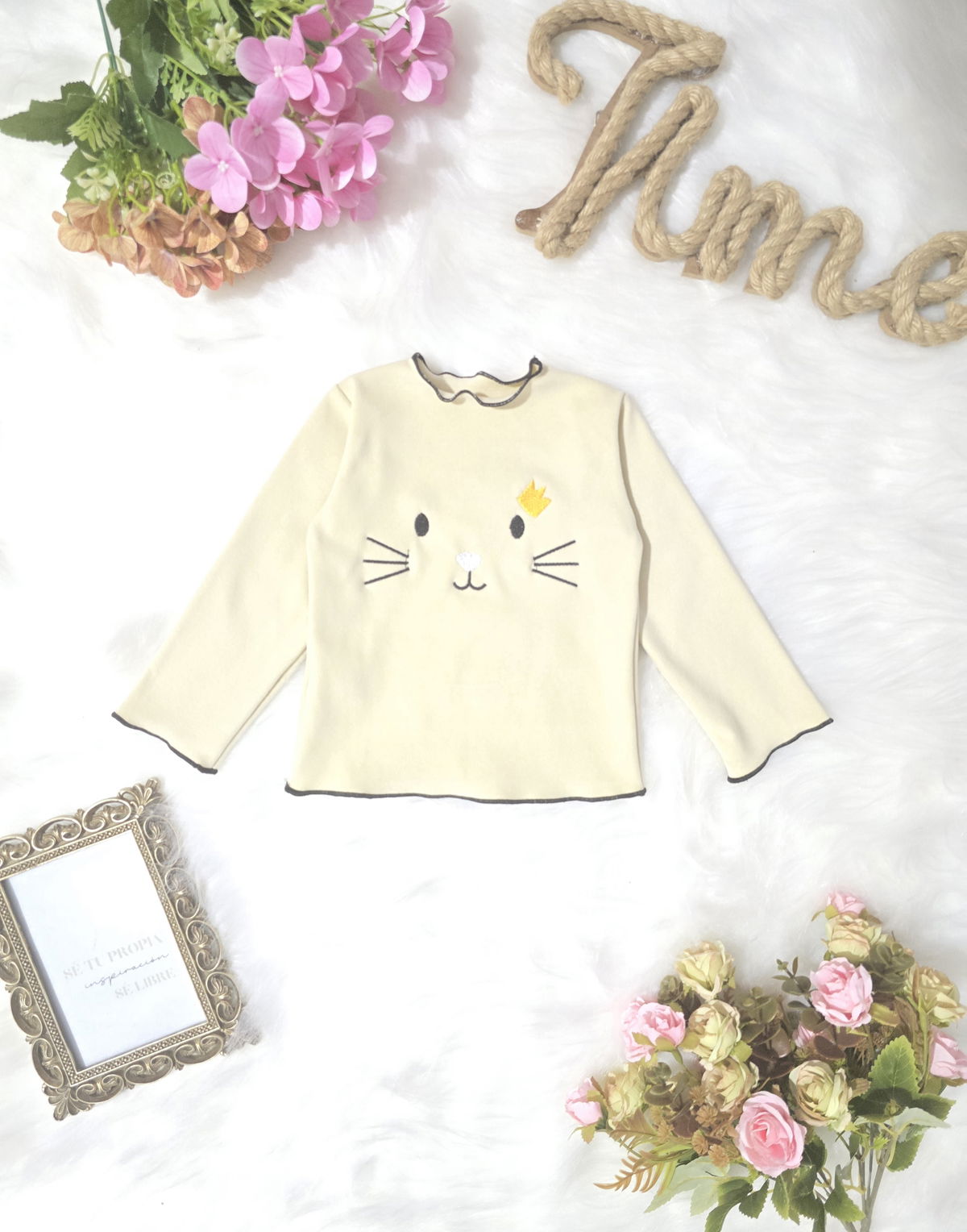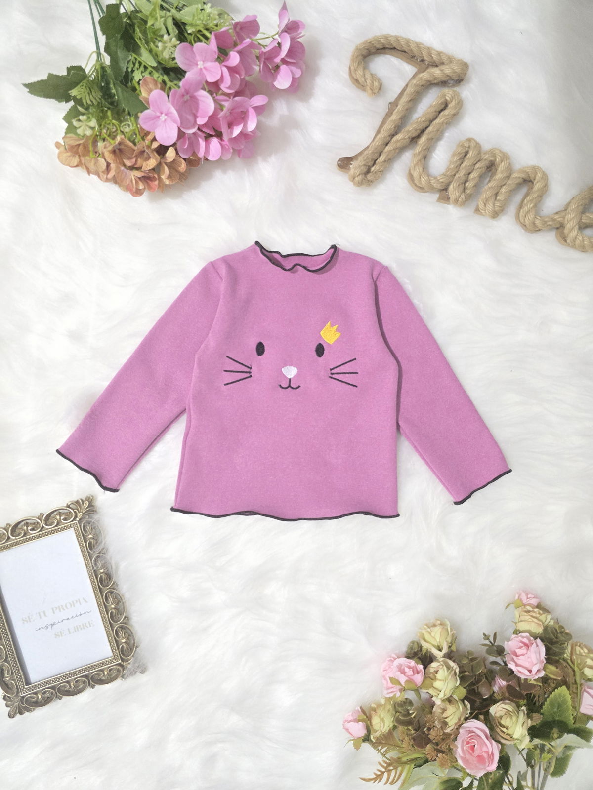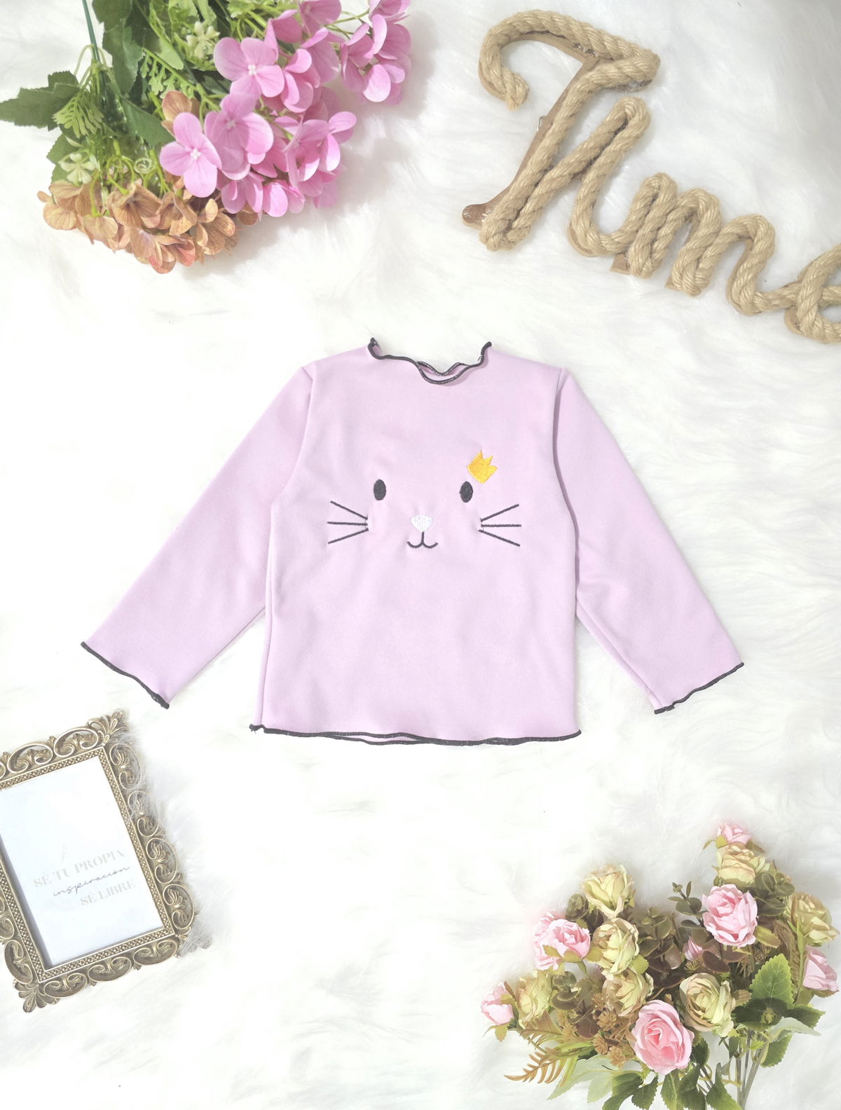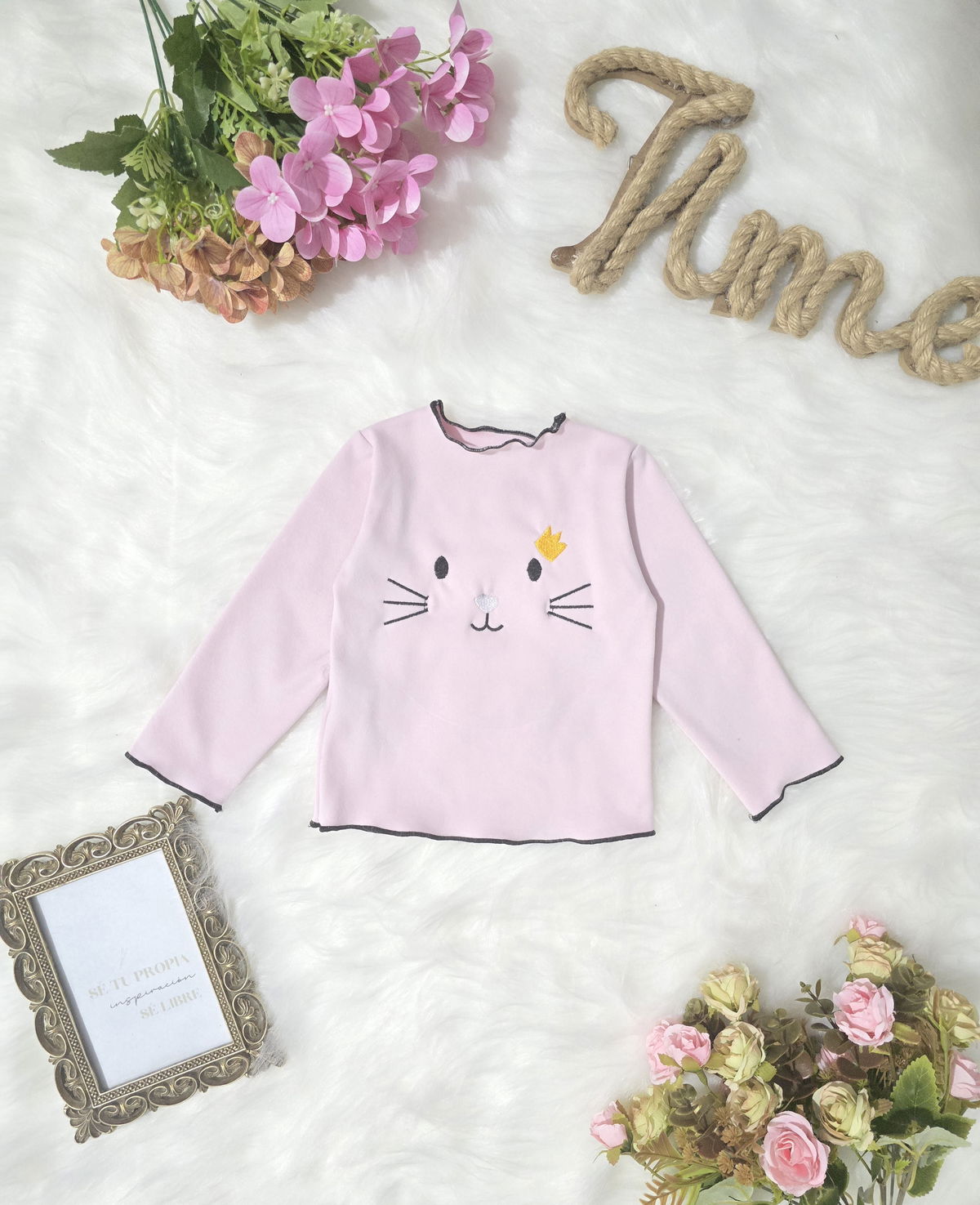 Camiseta de beba confeccionada en tela darlon, suave, cómoda y de excelente calidad. Diseño con gatito bordado y terminaciones con costura overlock en cuello, mangas y cintura, que aportan un detalle delicado y diferencial.