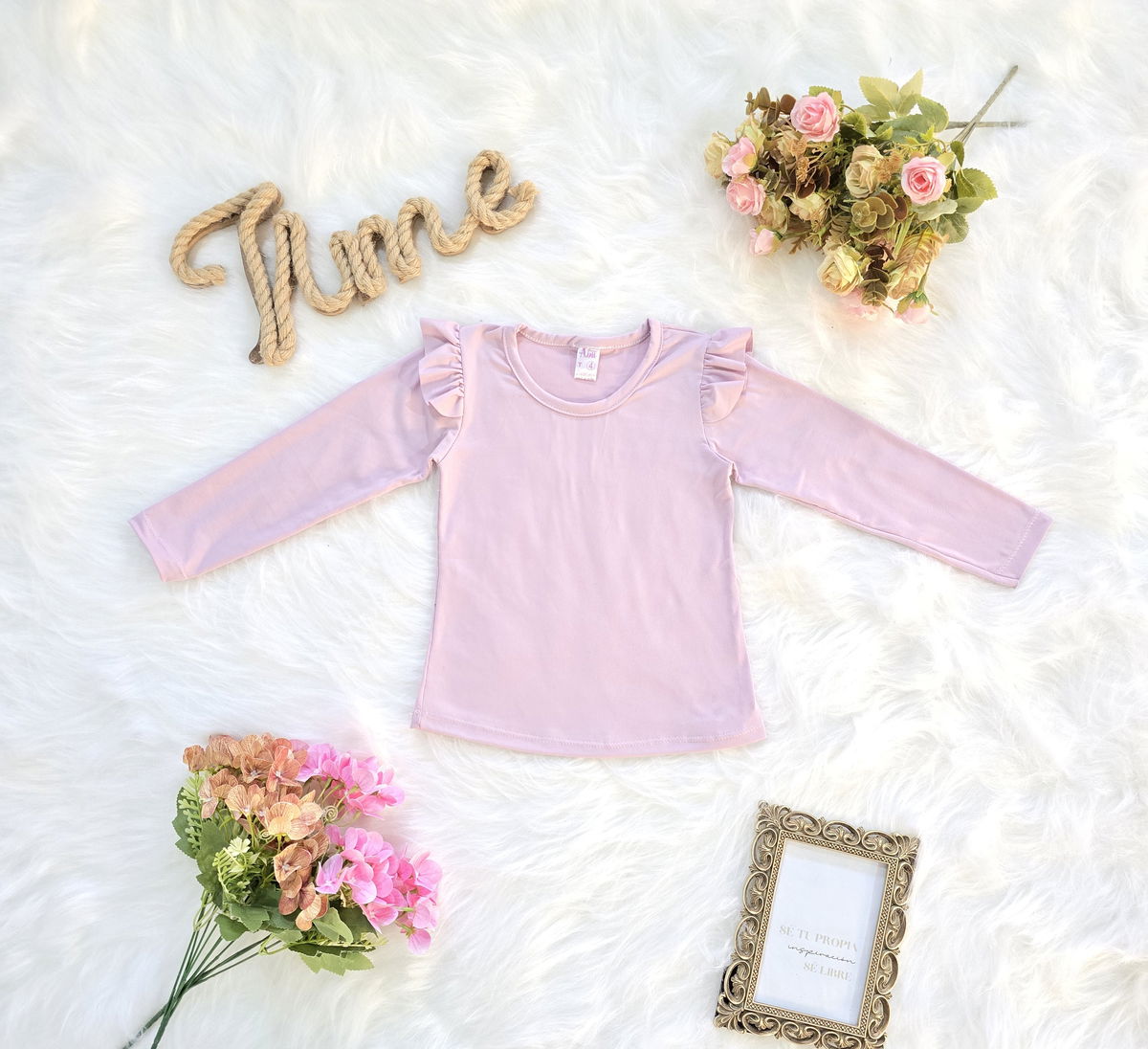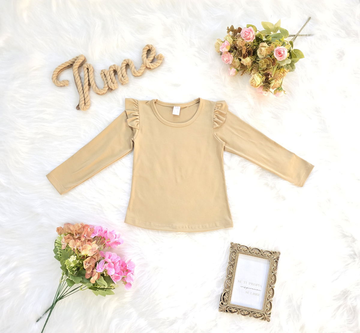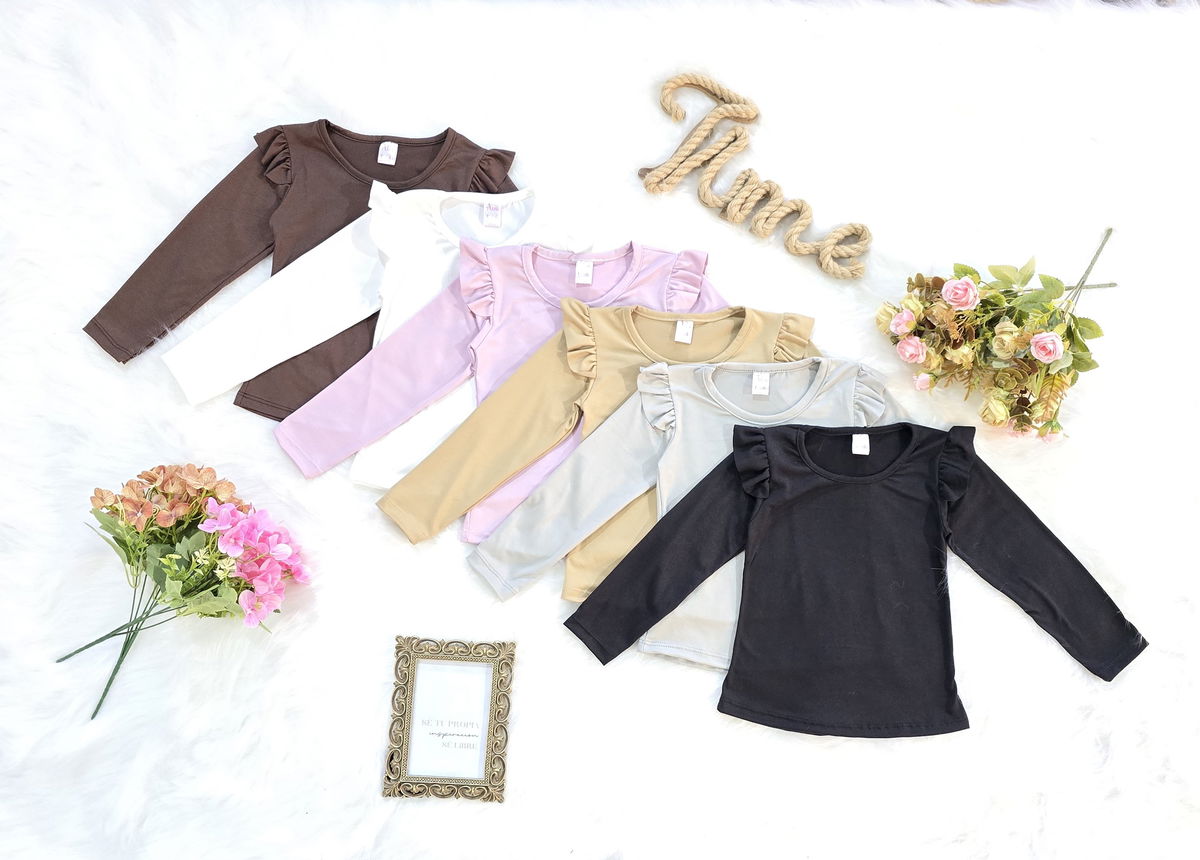 Camiseta confeccionada en tela modal soft, reconocida por su suavidad, elasticidad y confort. Su diseño con volados en los hombros le aporta un estilo delicado y moderno, ideal para complementar cualquier look infantil.
