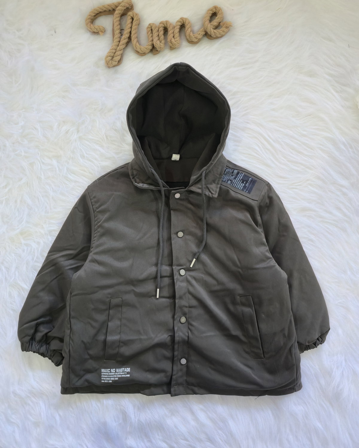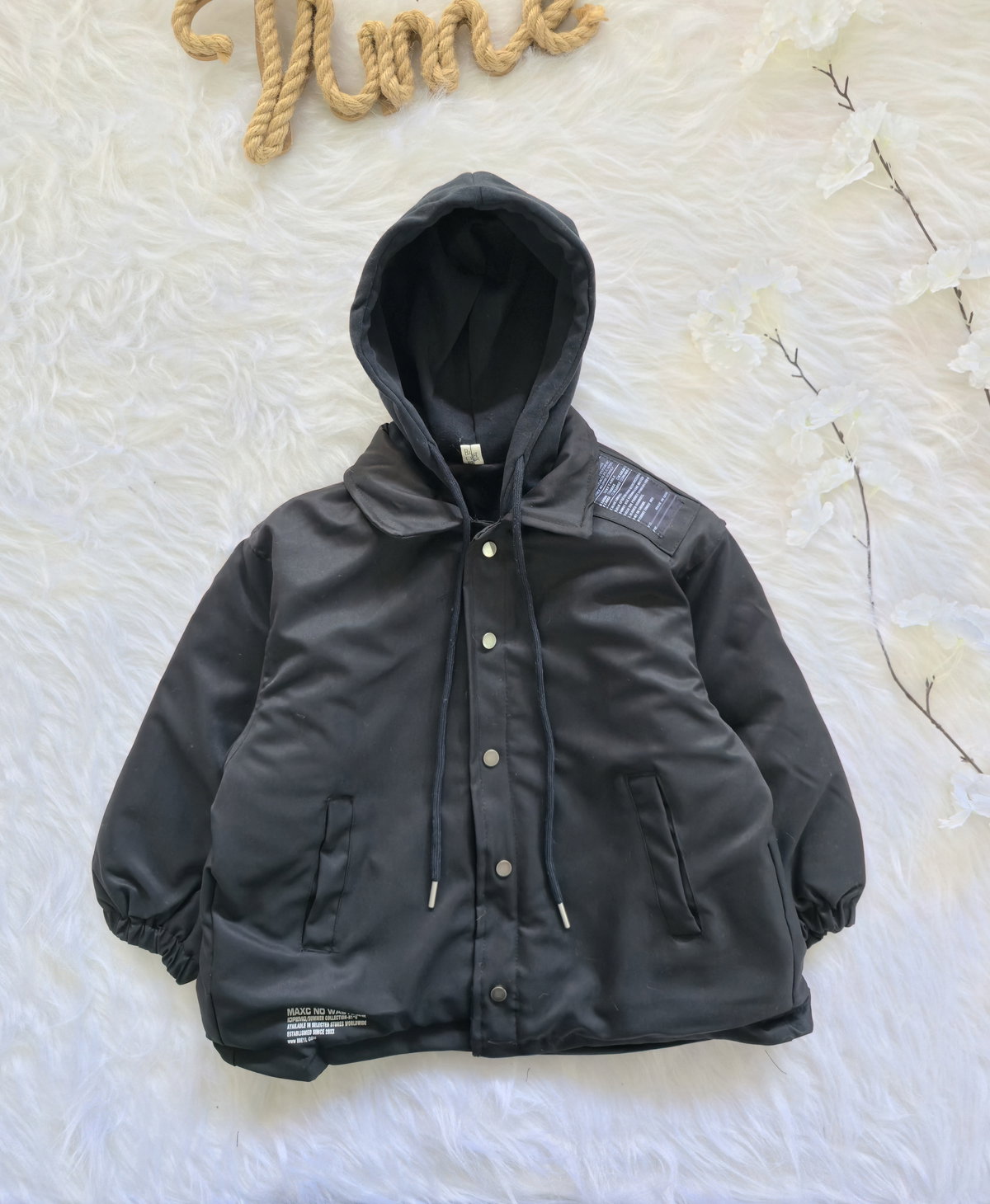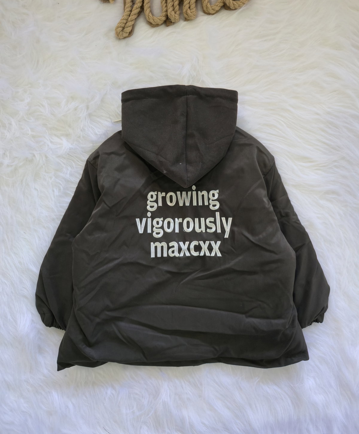Campera con capucha y detalle de estampa/bordado en espalda.