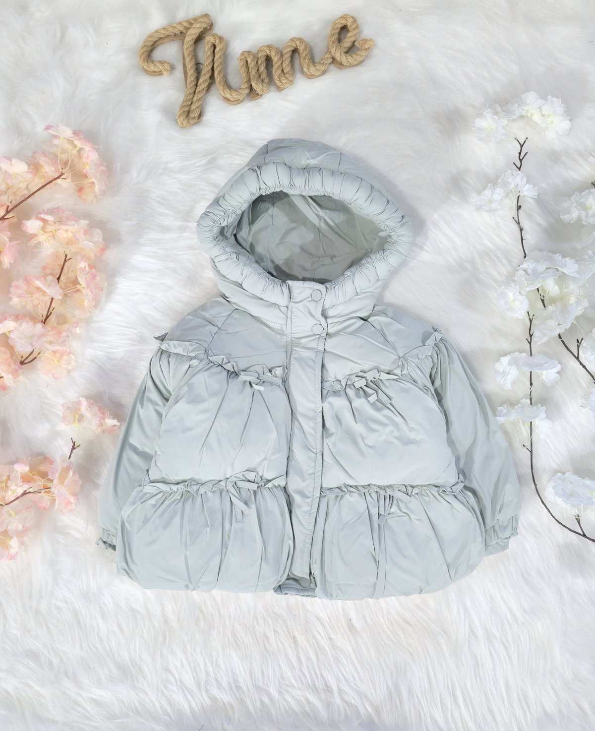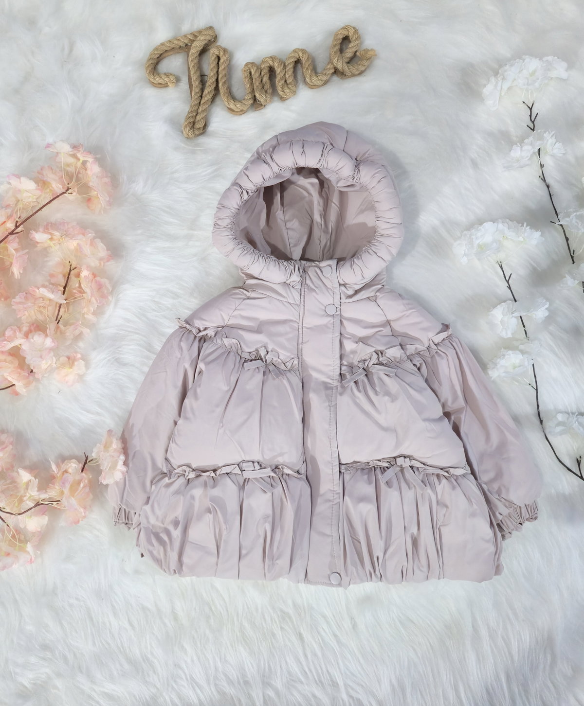 Campera tipo puffer con volumen (efecto globo), con detalles de moño.