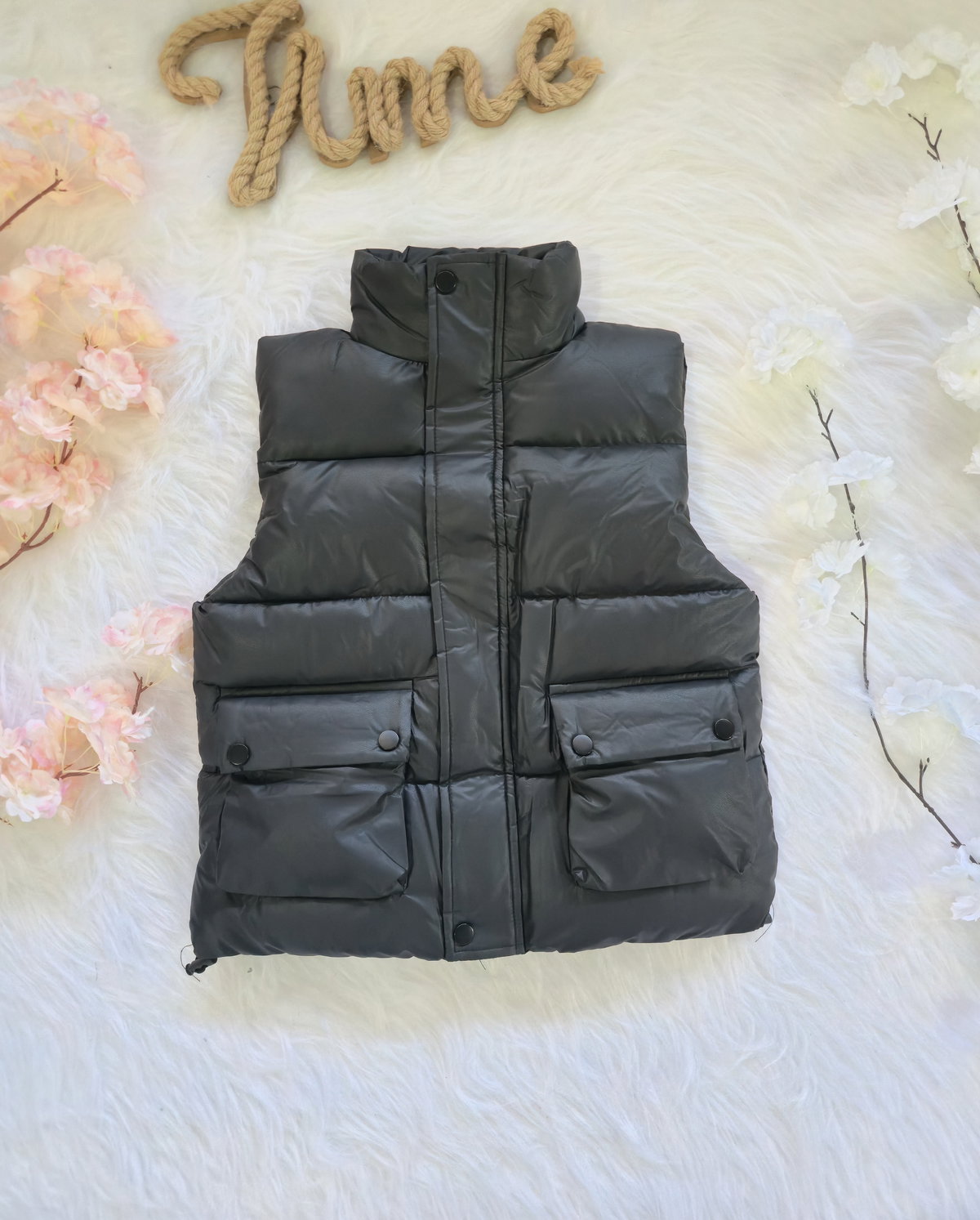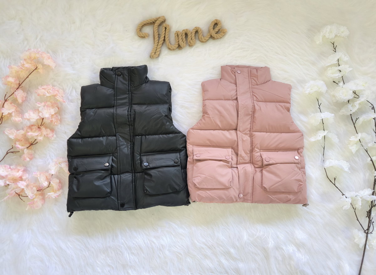 Chaleco tipo puffer con terminación engomada.
