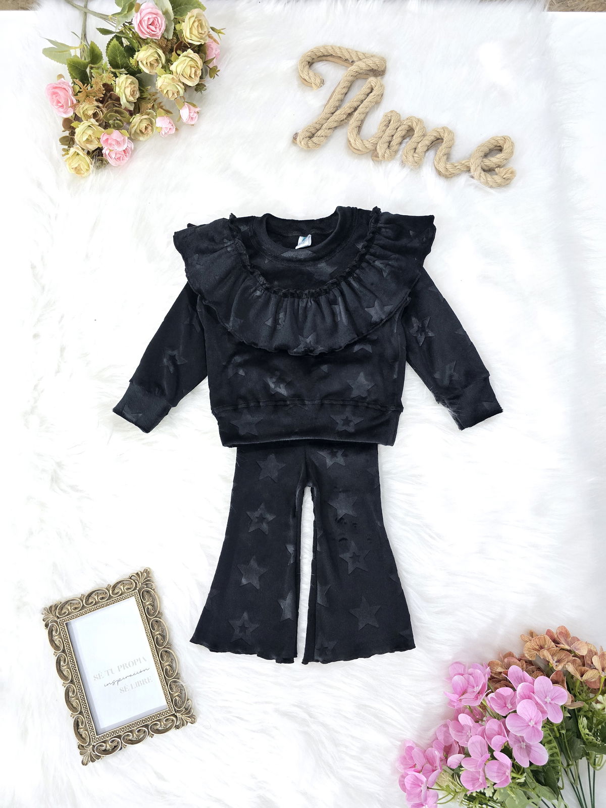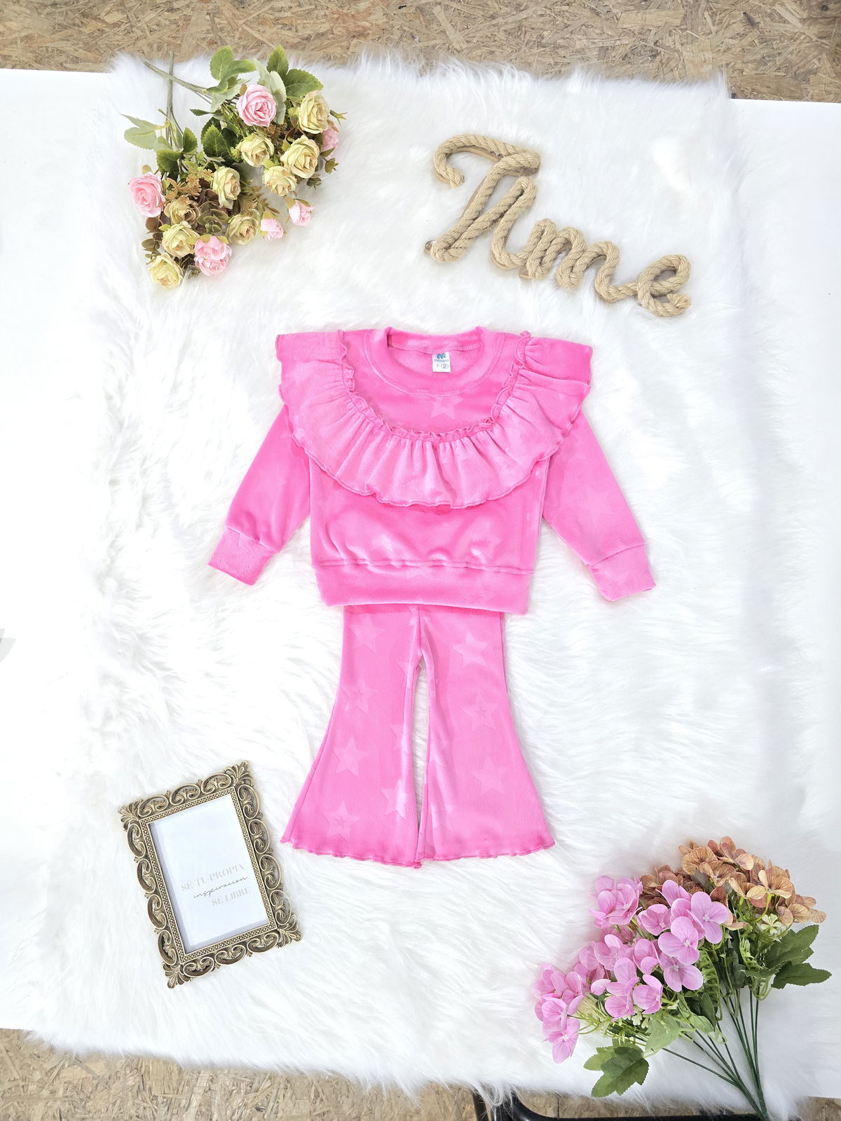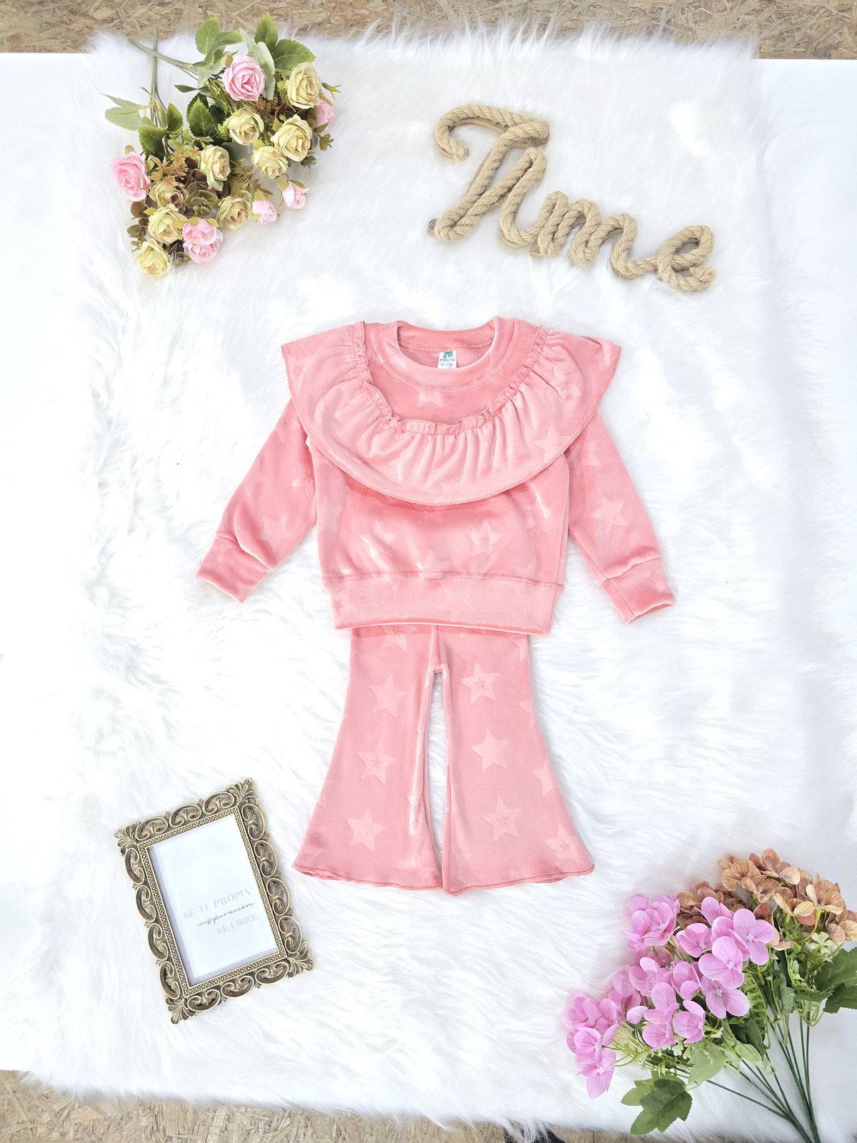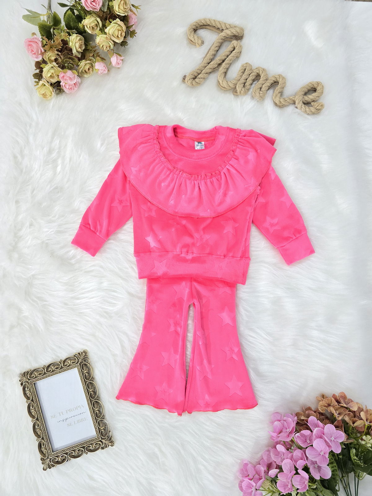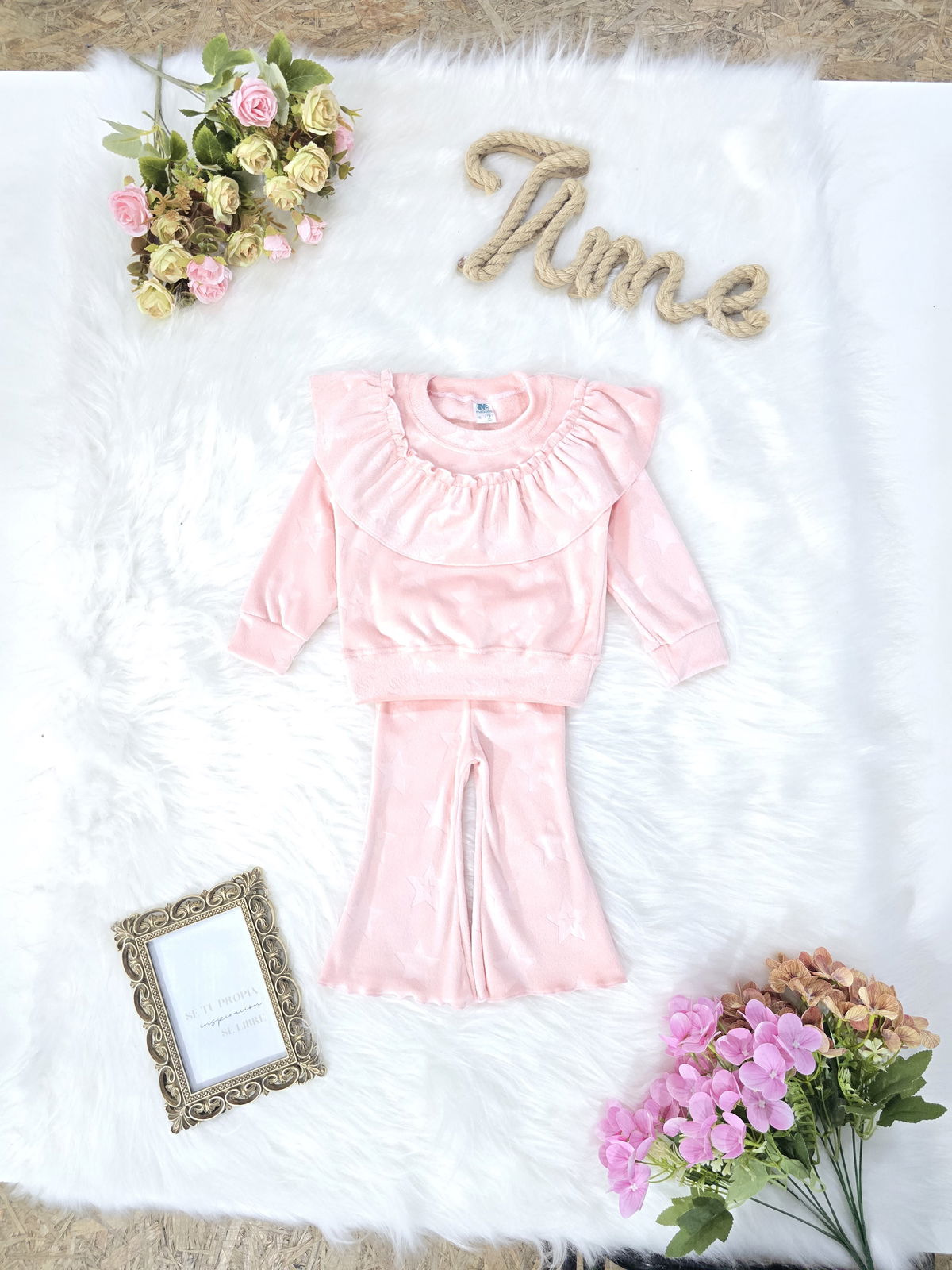 Conjunto de beba confeccionado en tela plush bifaz grofado, extra suave, abrigado y de excelente calidad. Incluye buzo con volado fruncido en el pecho y pantalón con cintura elastizada. Diseño con textura de estrellas y terminaciones reforzadas.