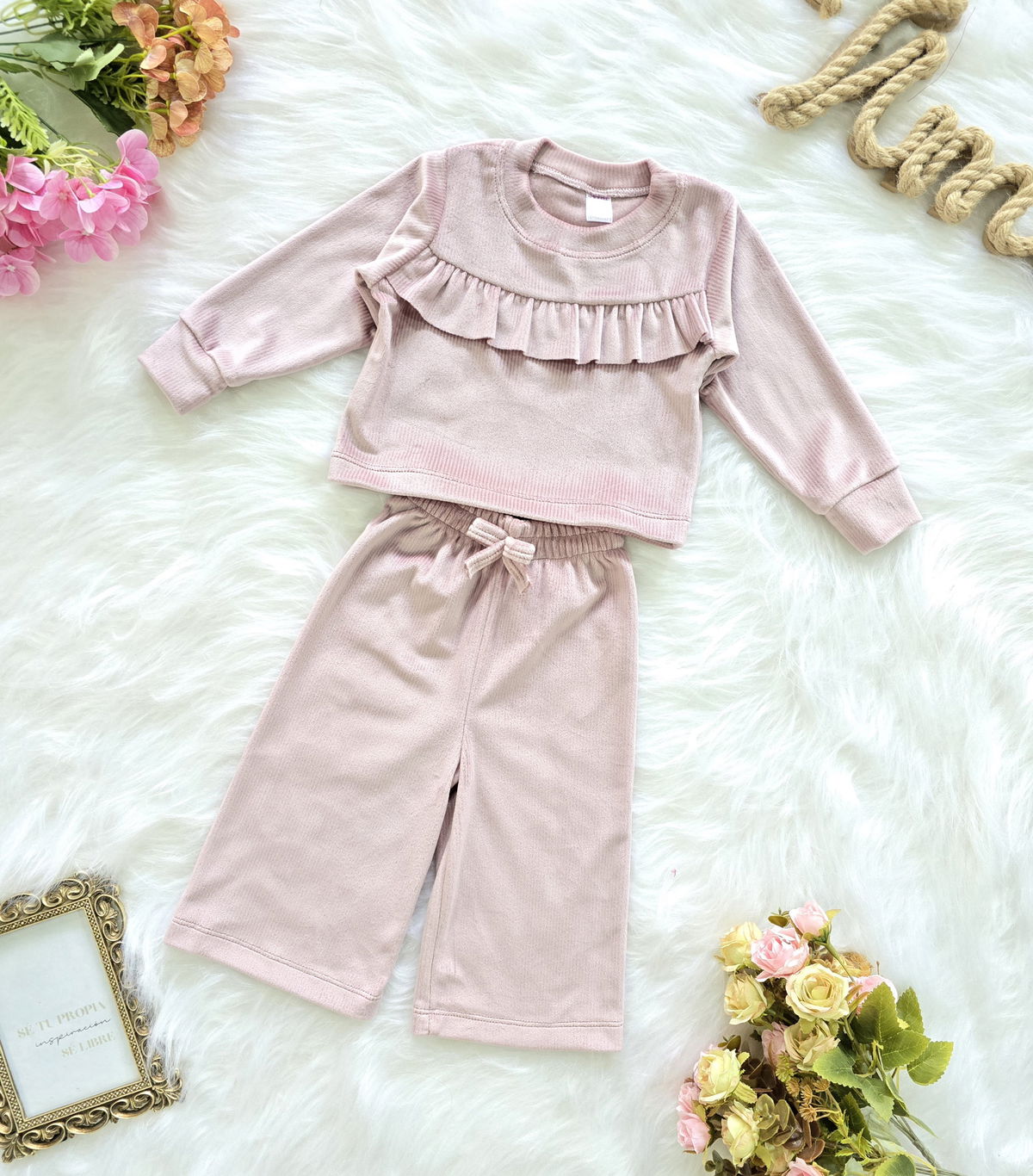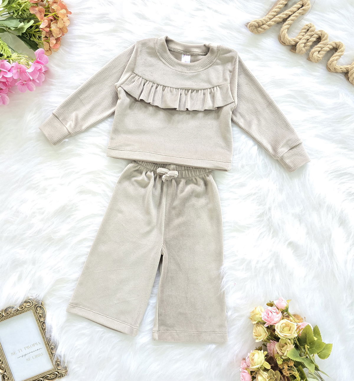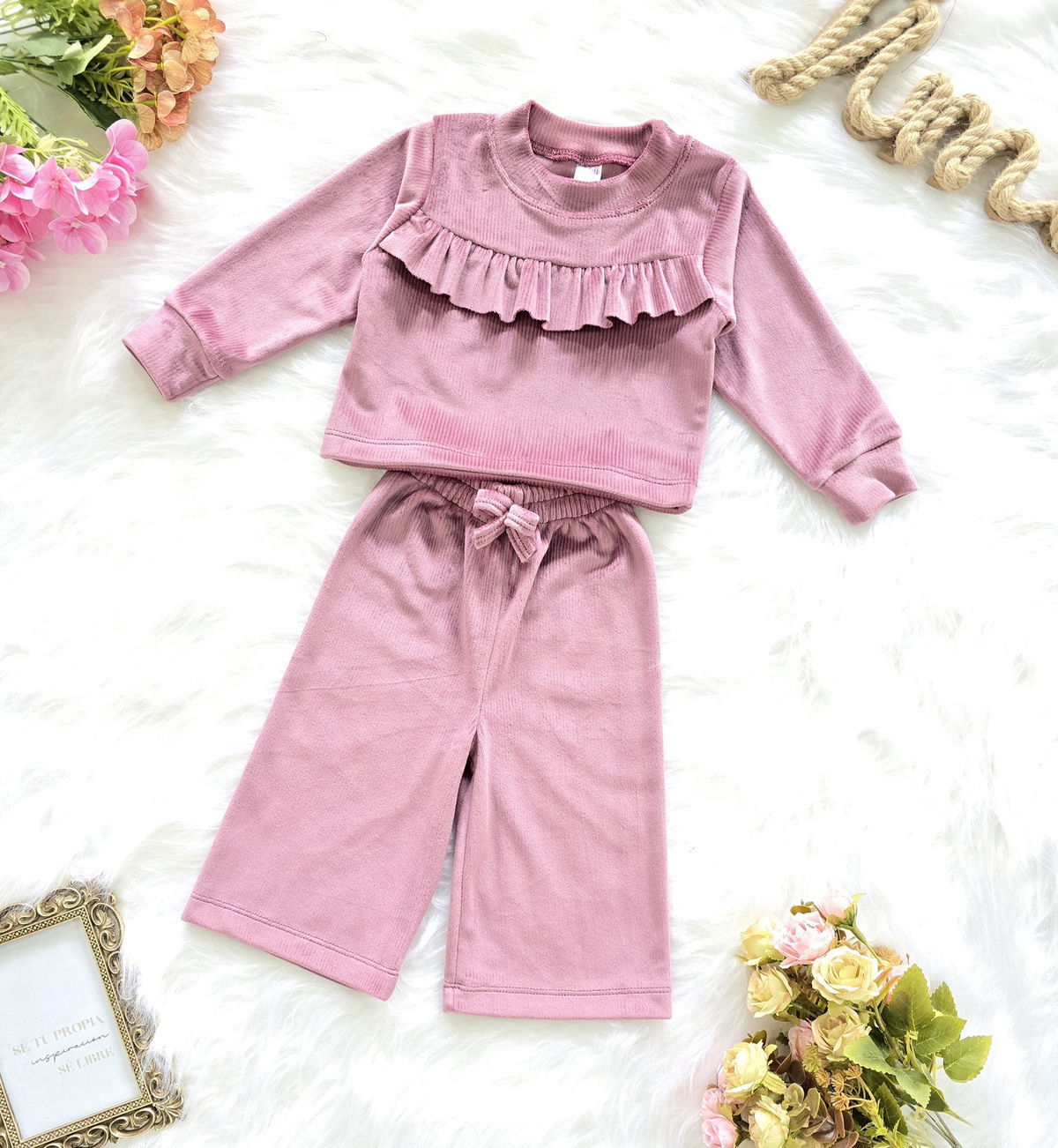 Conjunto de beba confeccionado en tela plush morley no bifaz, suave, cómodo y de excelente calidad. Incluye buzo con volado fruncido en el pecho y pantalón modelo palazo con cintura elastizada y cordón ajustable.