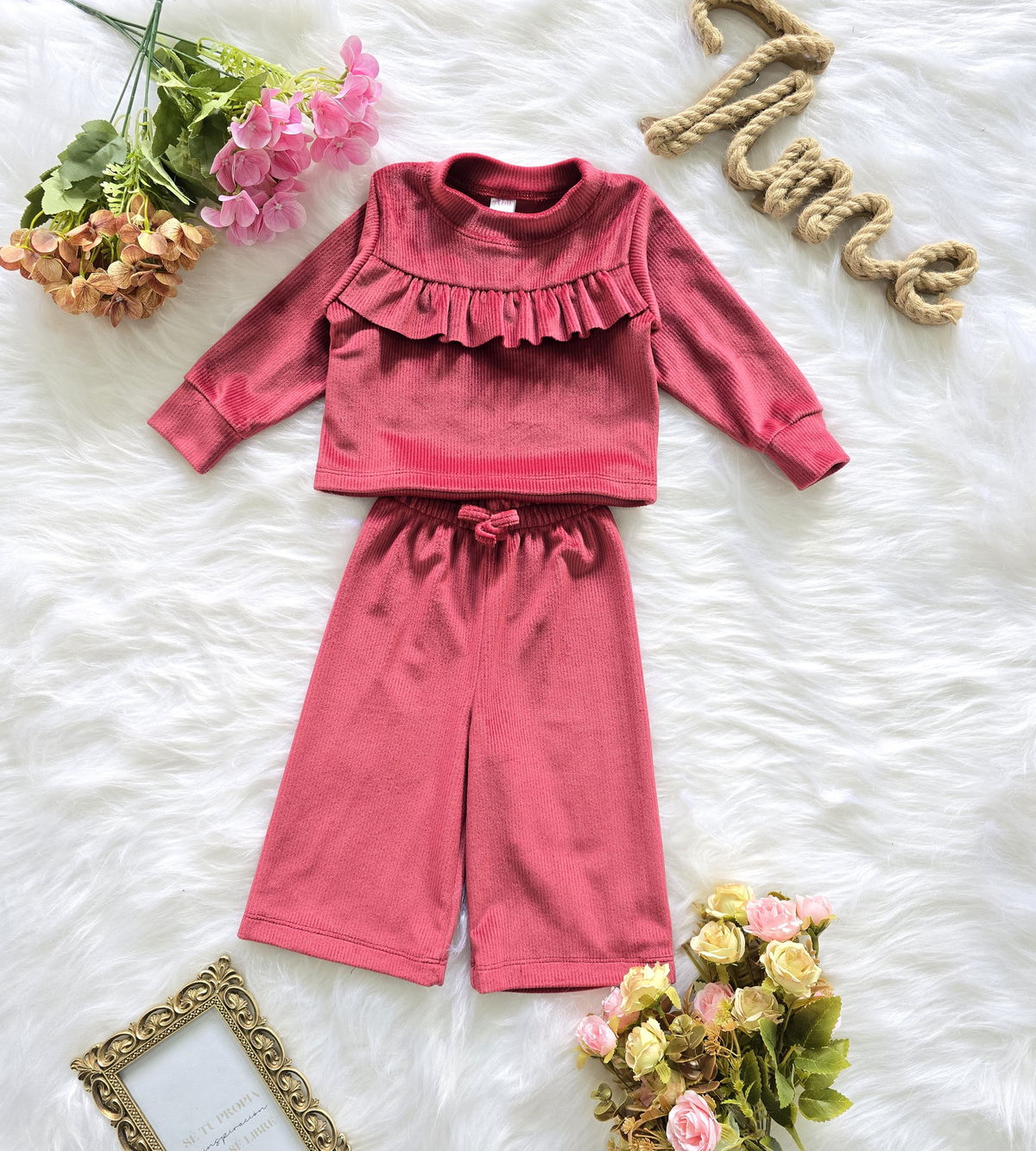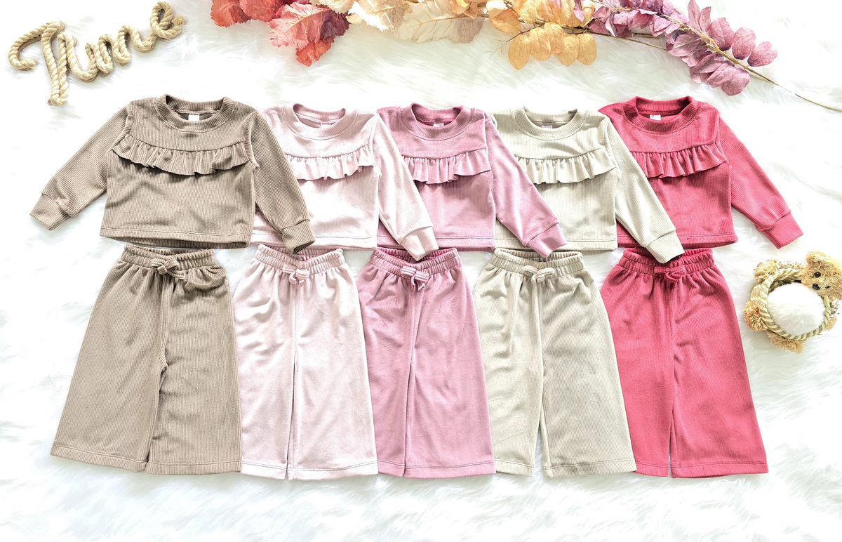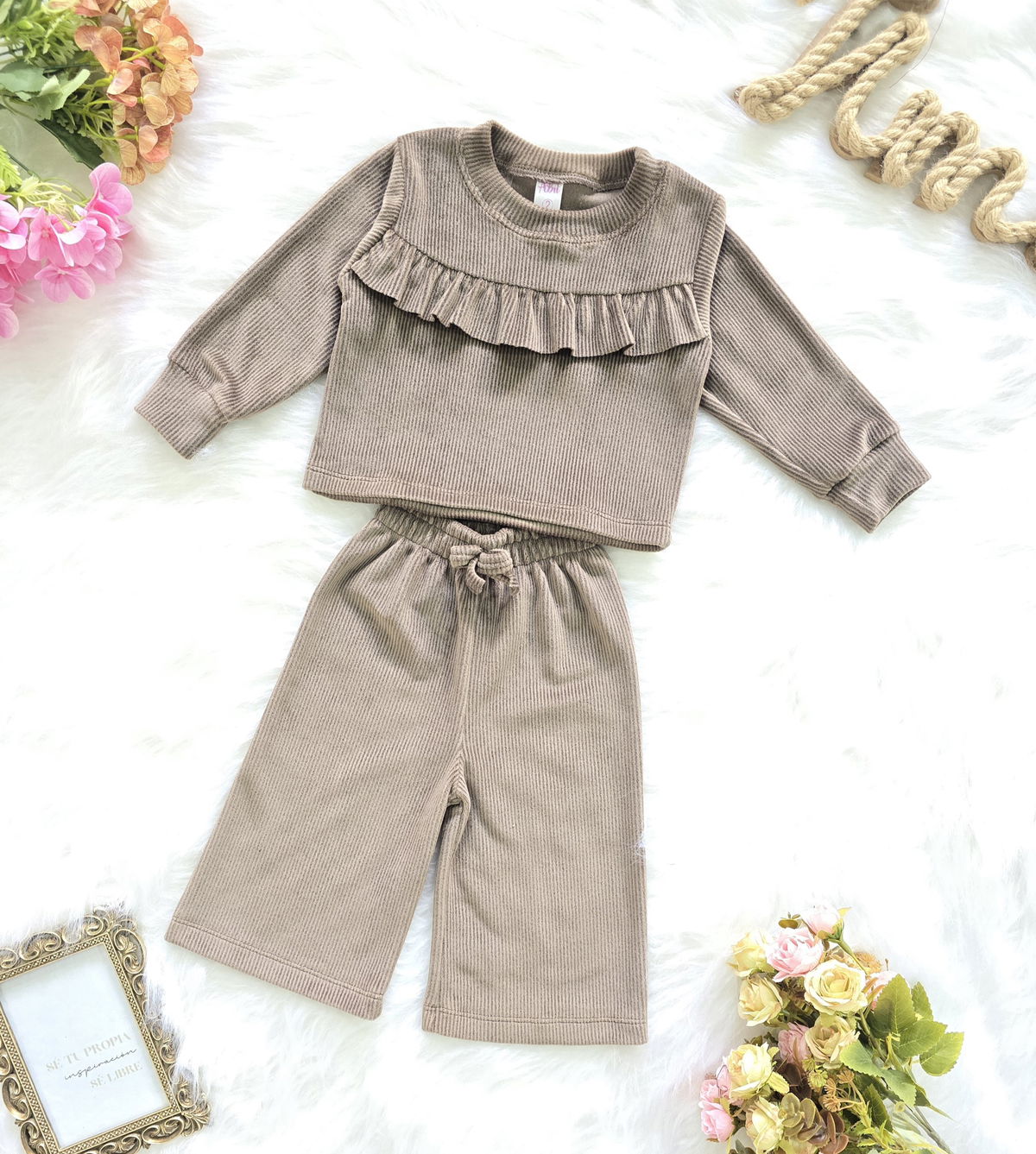 Conjunto de beba confeccionado en tela plush morley no bifaz, suave, cómodo y de excelente calidad. Incluye buzo con volado fruncido en el pecho y pantalón modelo palazo con cintura elastizada y cordón ajustable.