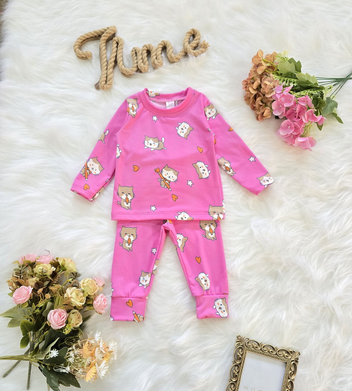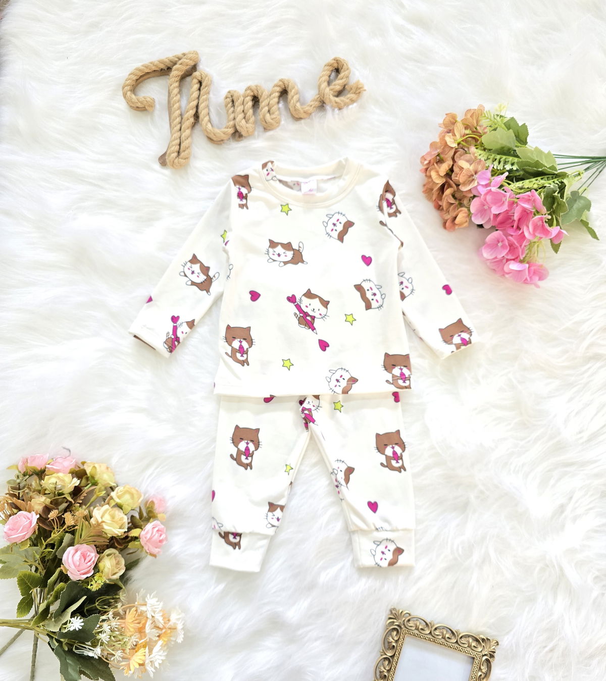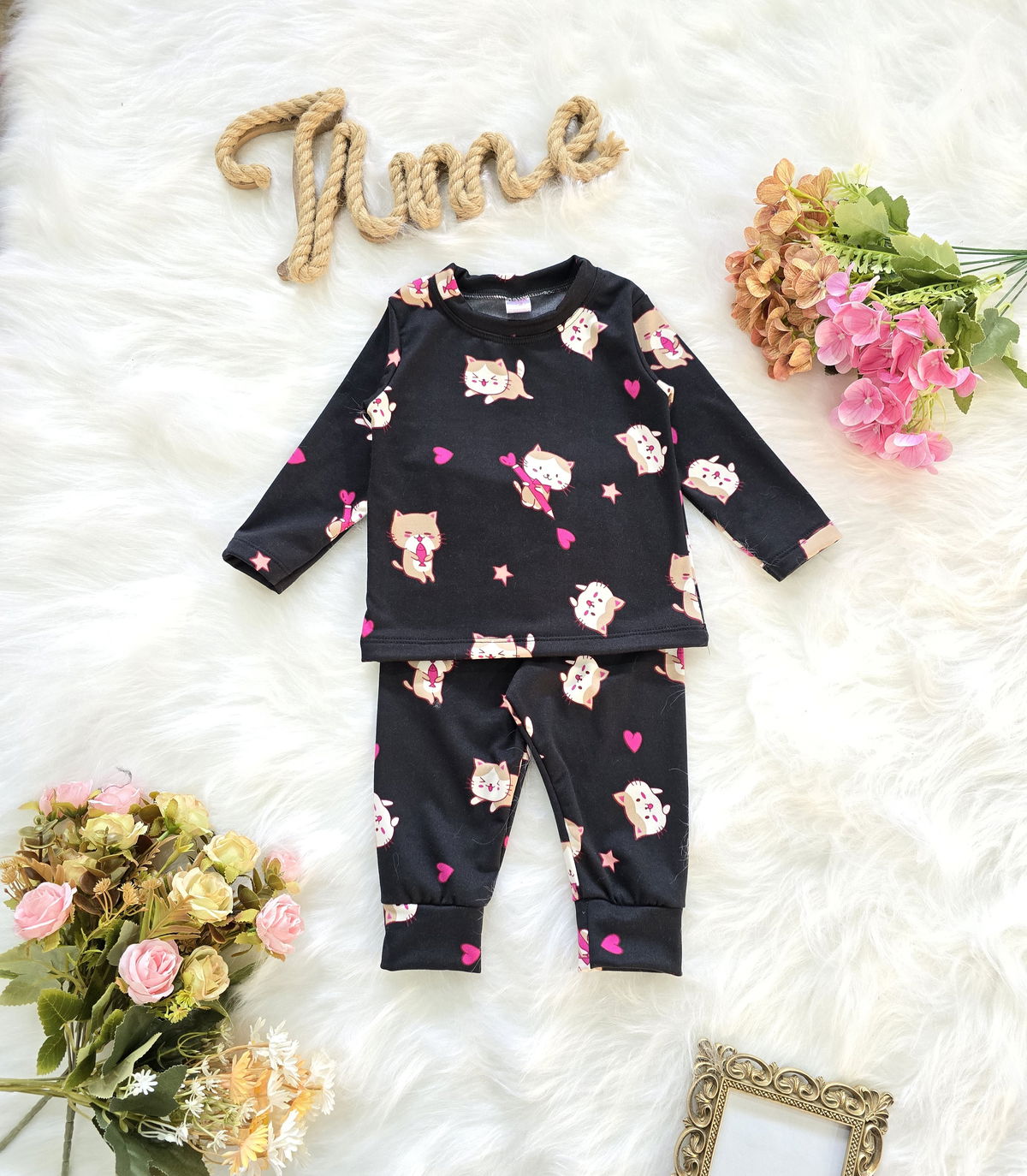 Conjunto de beba confeccionado en tela soft térmico, suave, abrigada y liviana, ideal para mantener el calor corporal sin perder comodidad. Incluye camiseta de manga larga y pantalón con cintura elastizada, ambos con estampa de gatitos y corazones que aportan un detalle tierno y delicado.