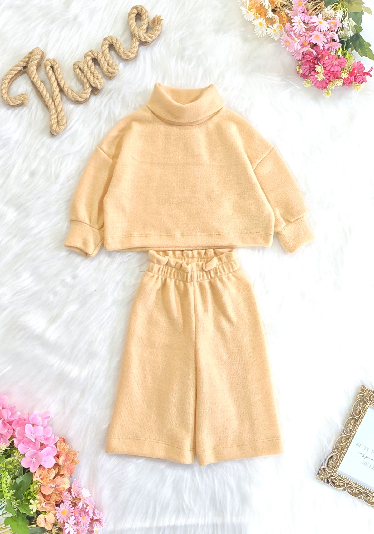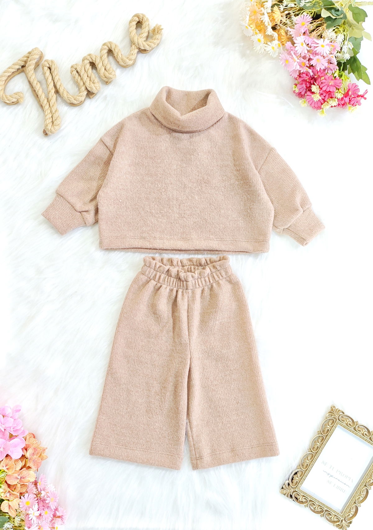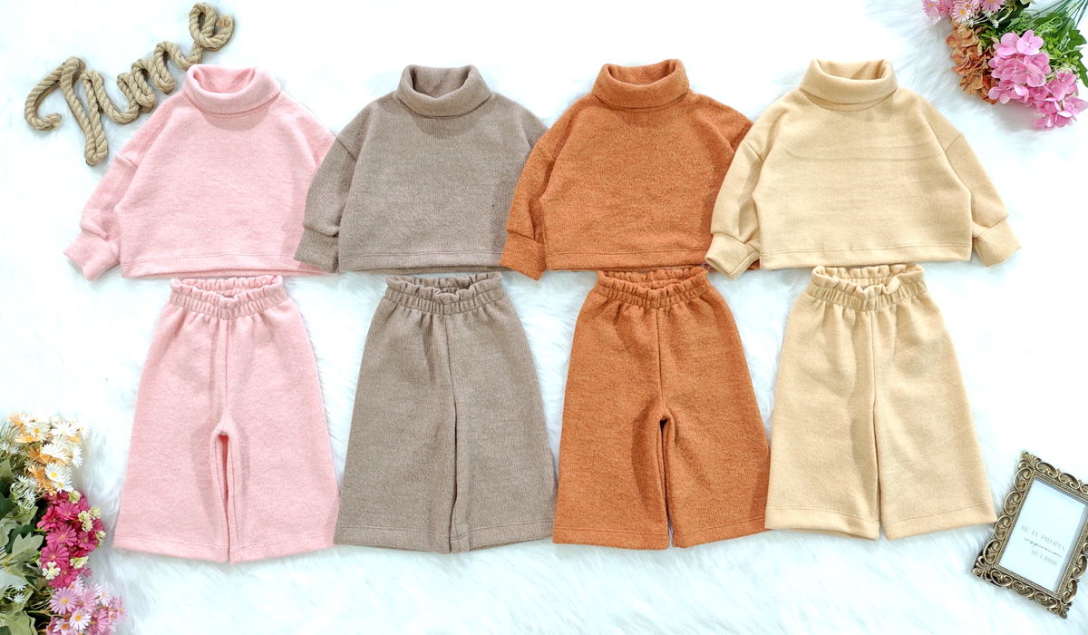 Conjunto de beba confeccionado en lanilla Aspen, tela abrigada, suave y confortable, ideal para los días de frío. Incluye buzo manga larga con cuello alto y pantalón tipo palazo, combinando abrigo y estilo en una sola prenda.