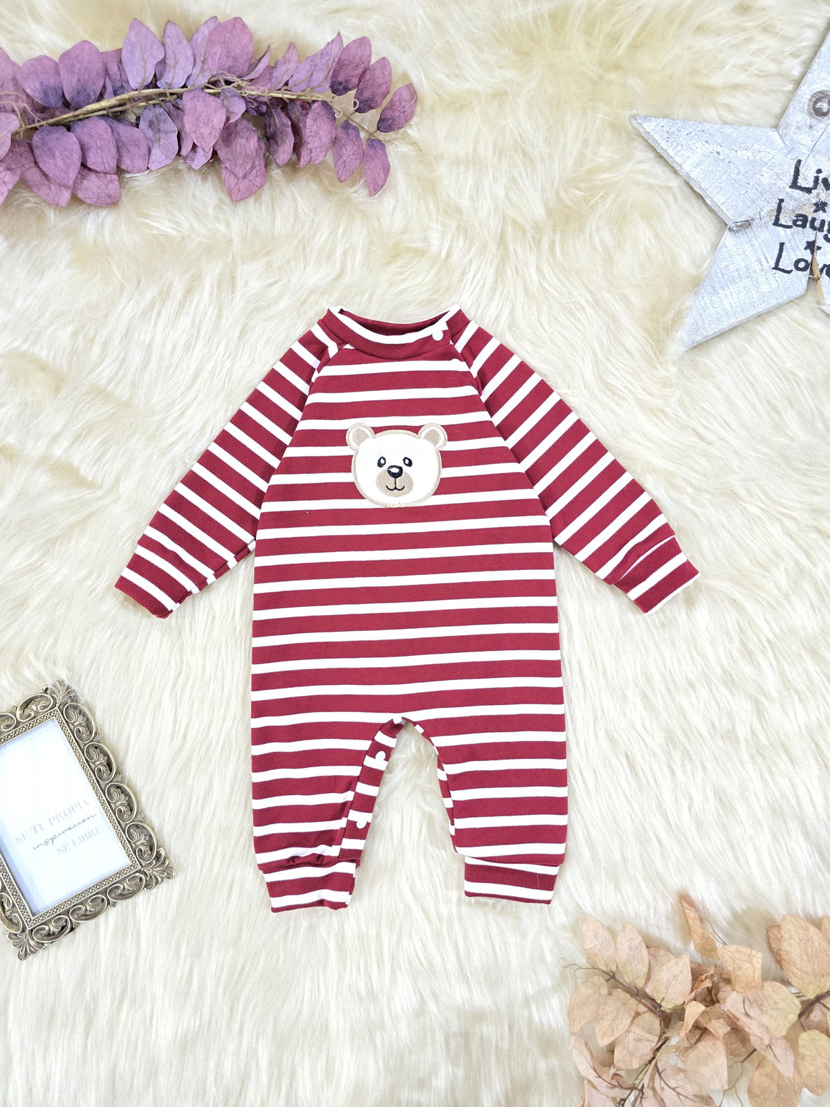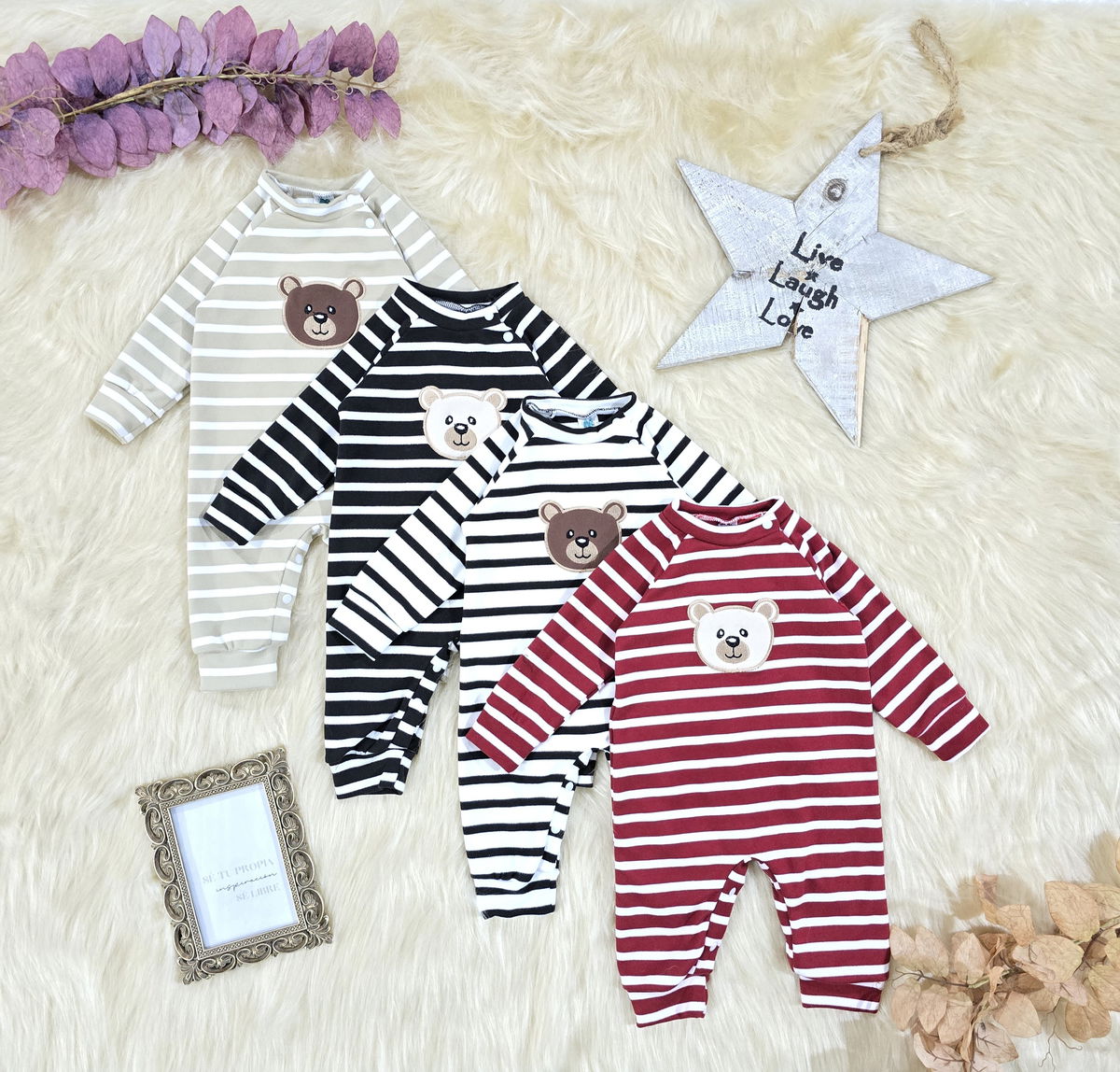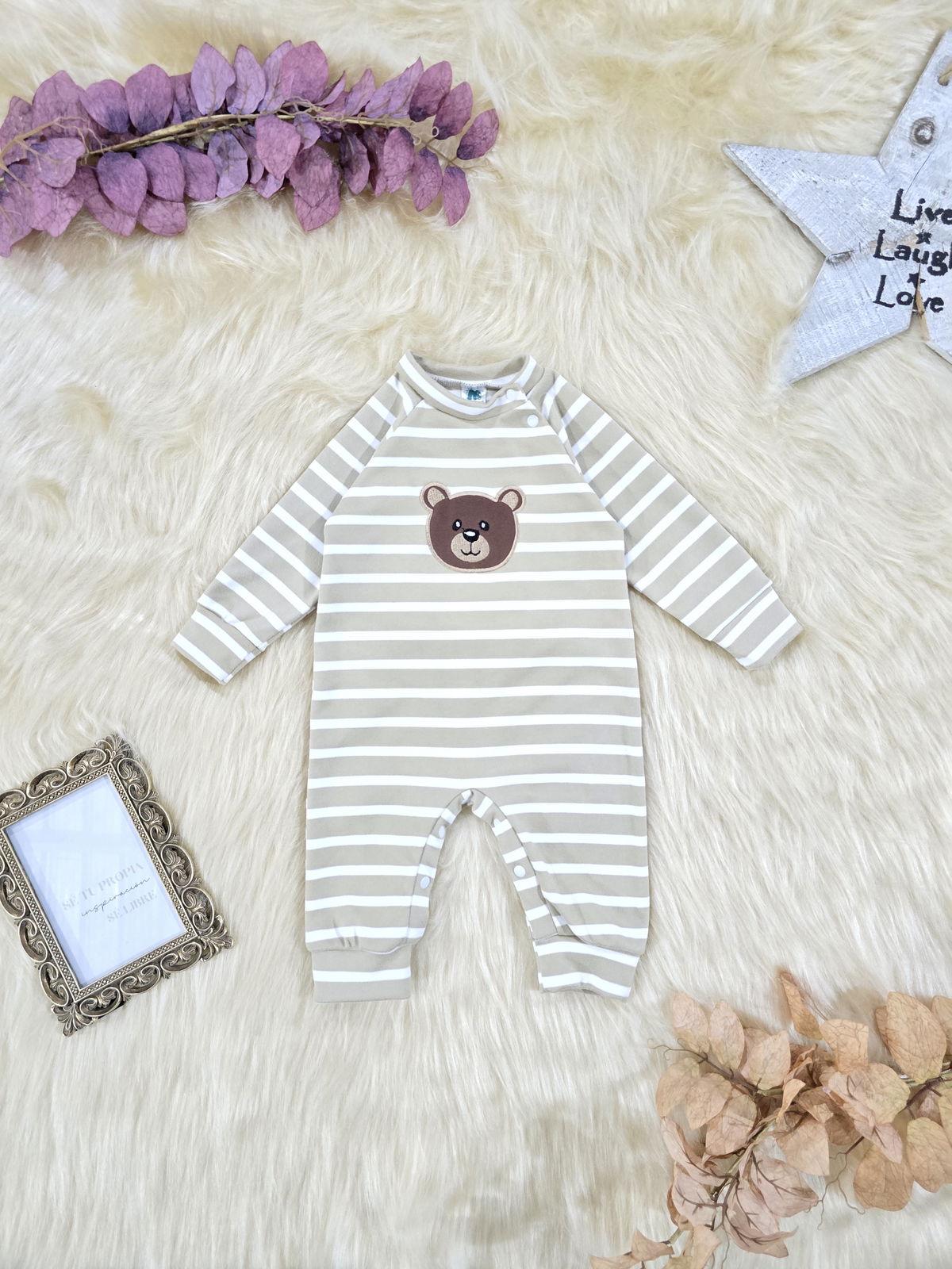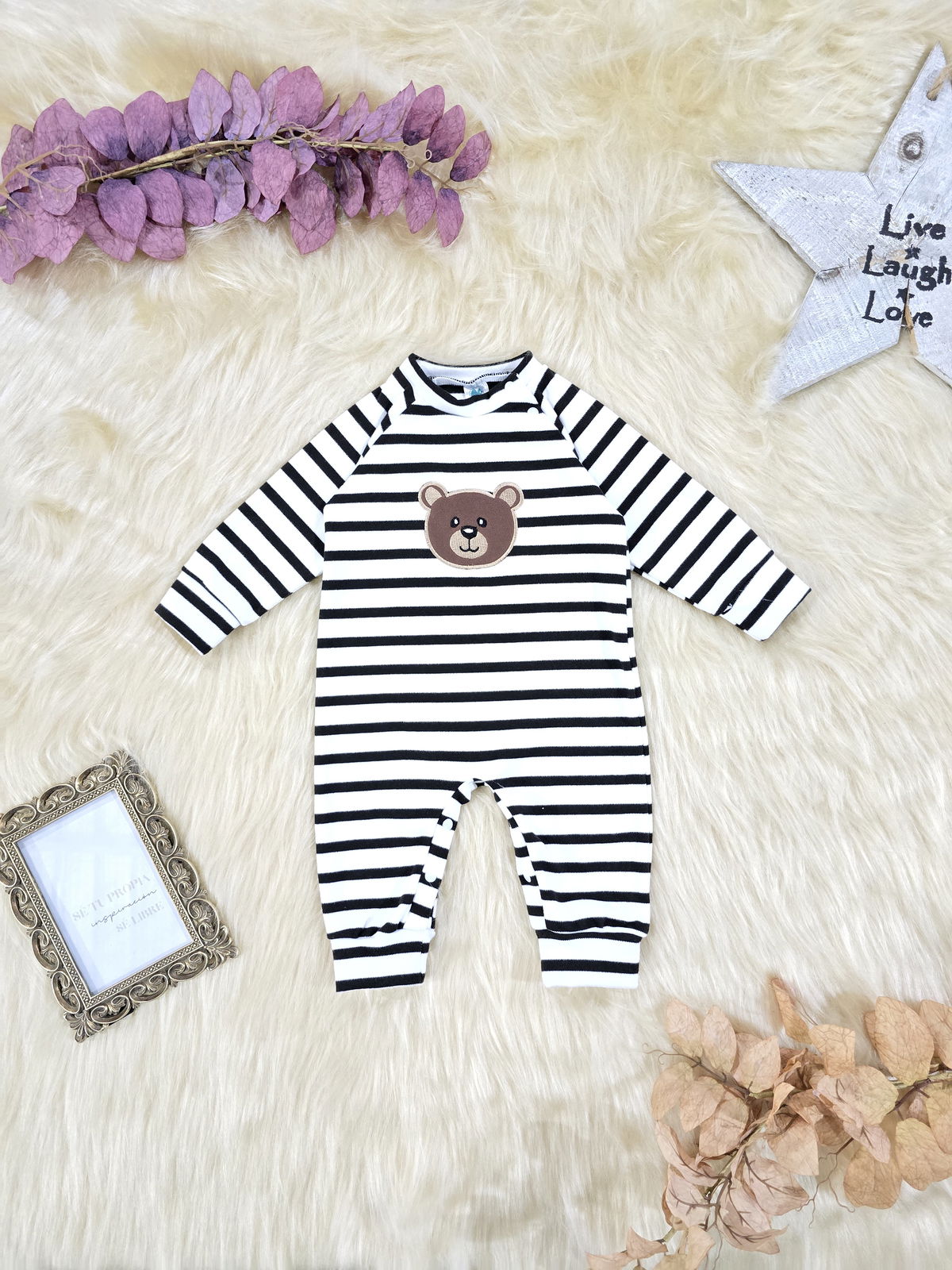 Entero confeccionado en tela darlon, suave, abrigada y cómoda, ideal para acompañar al bebé durante los días más frescos. Su diseño rayado con aplique de oso aporta un estilo tierno y moderno.