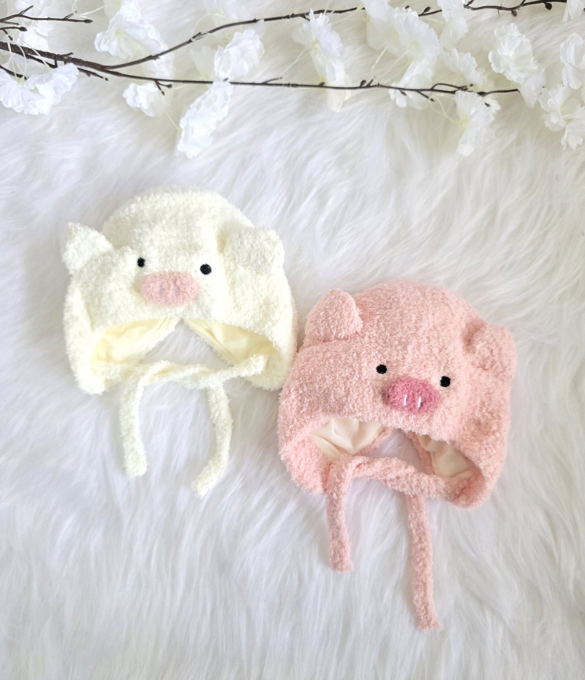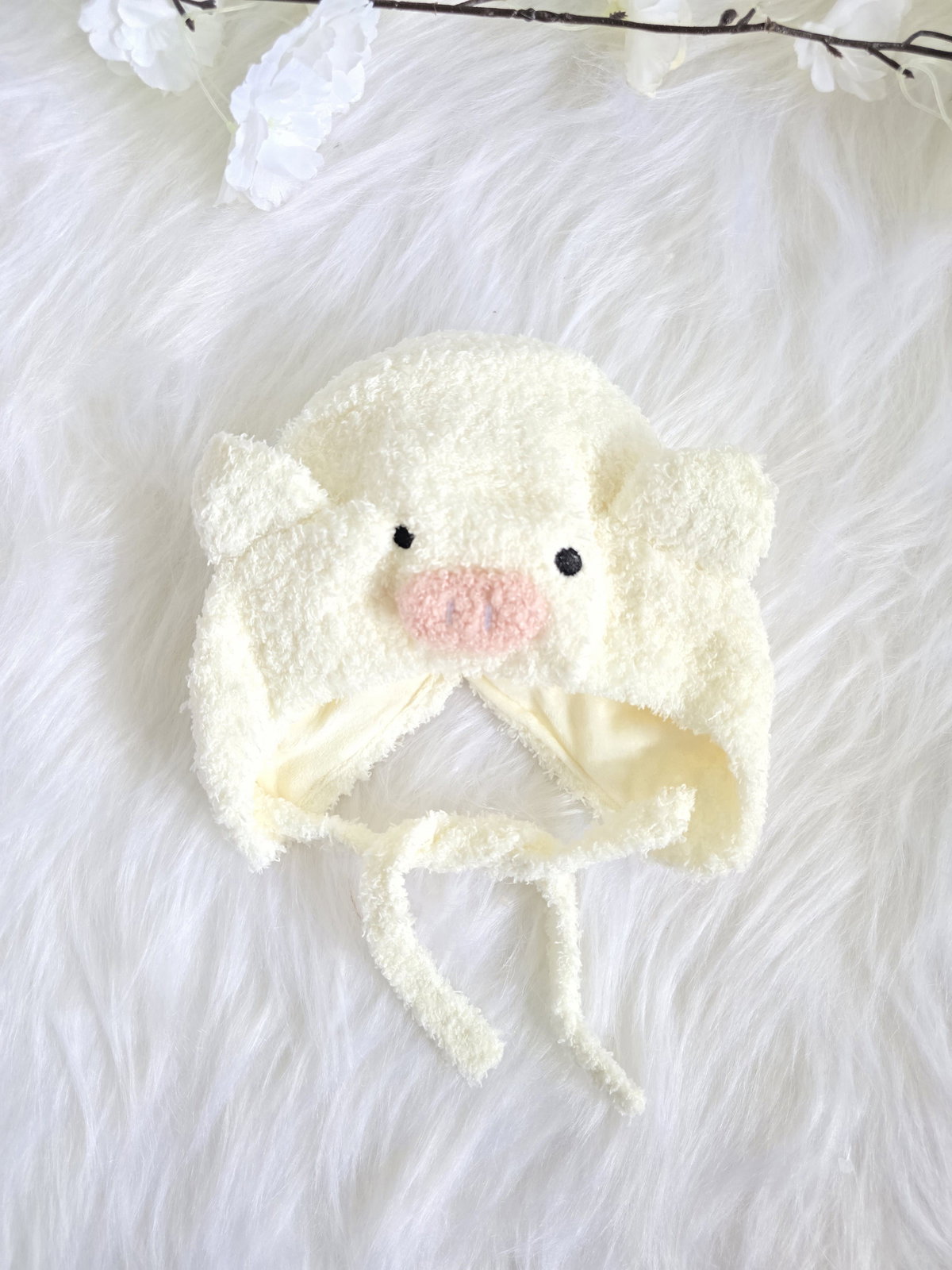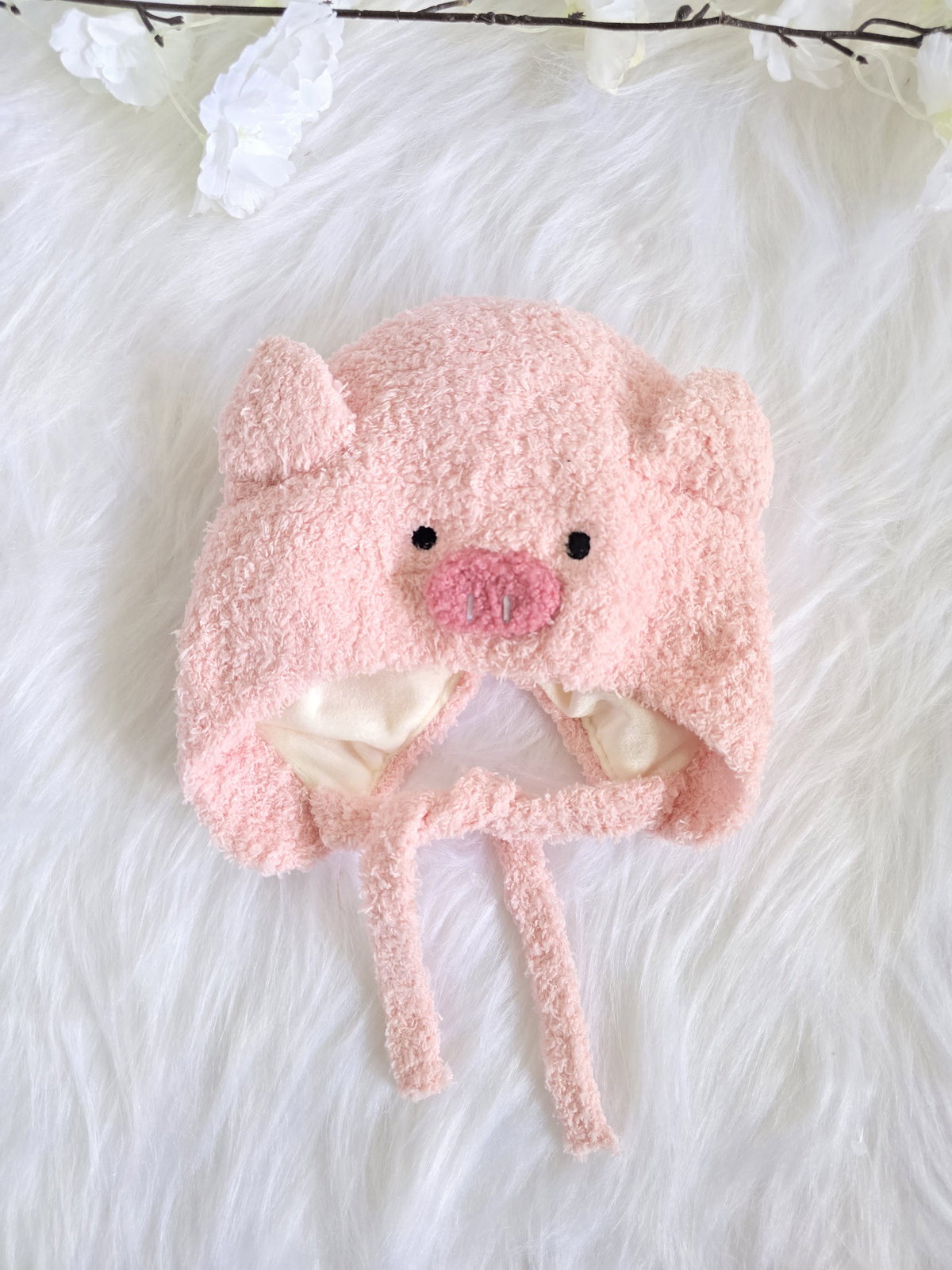 Gorro de peluche con diseño de chanchito.