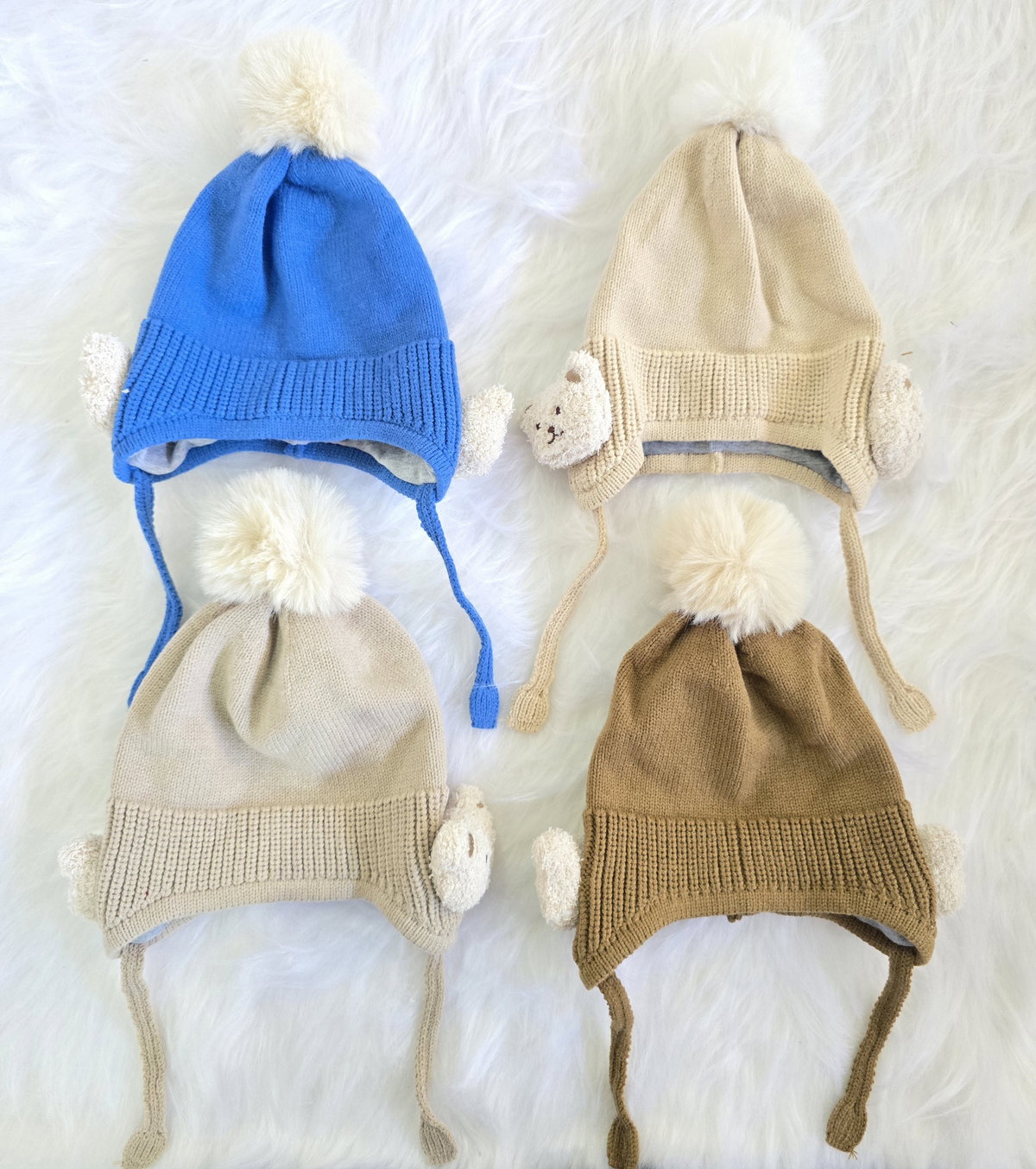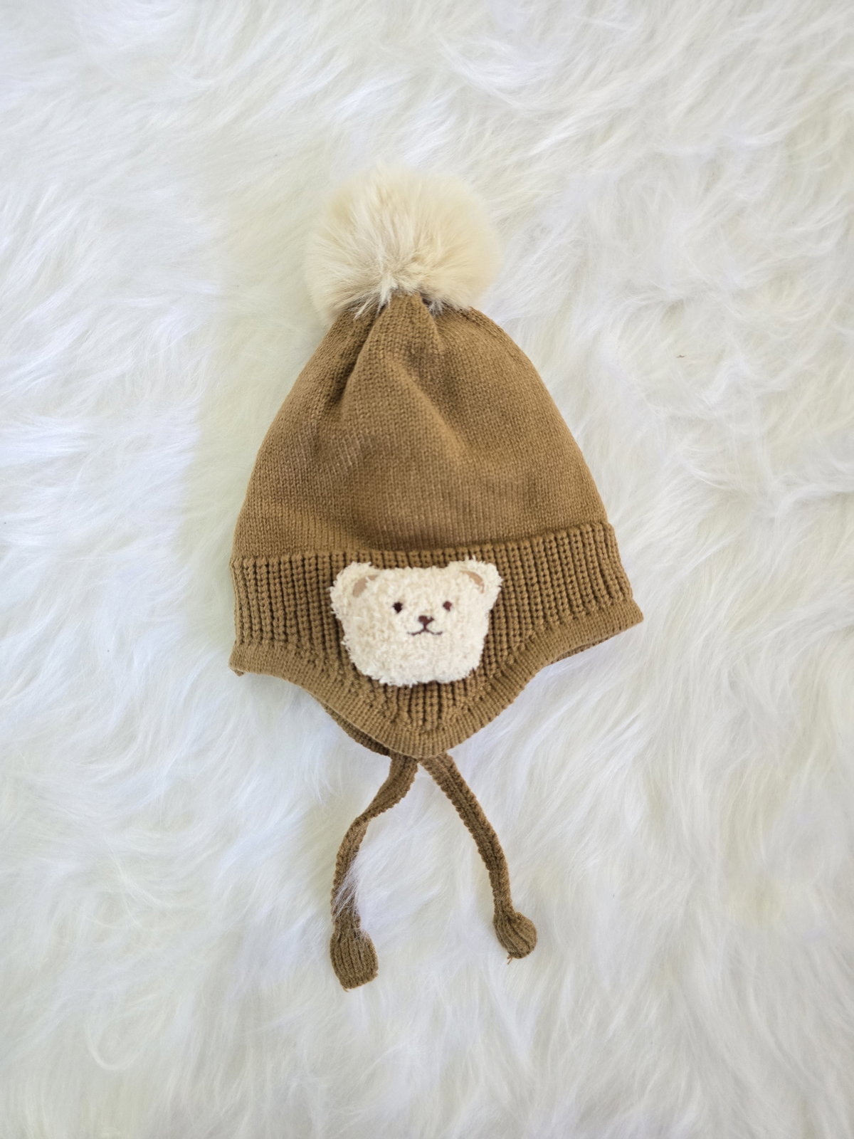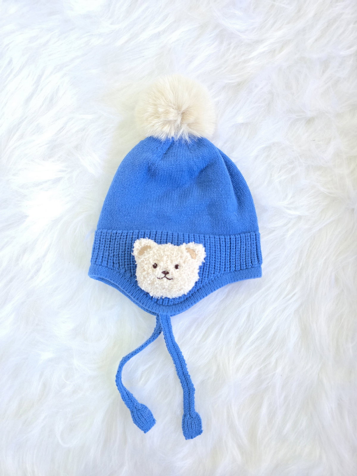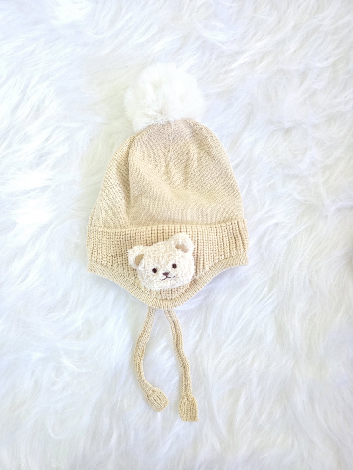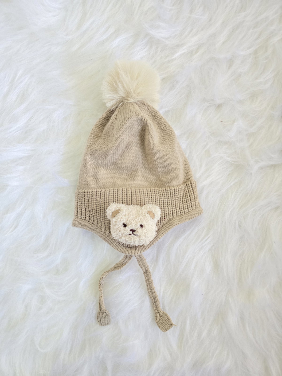 Gorro tejido tipo chullito con diseño de osito y pompón.