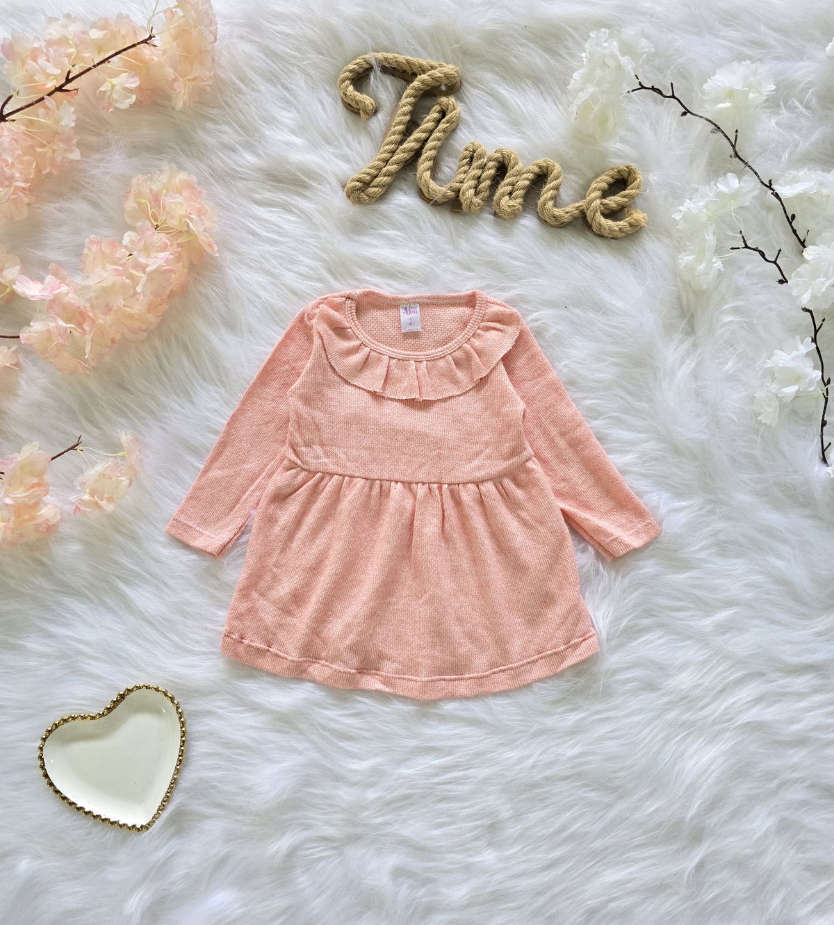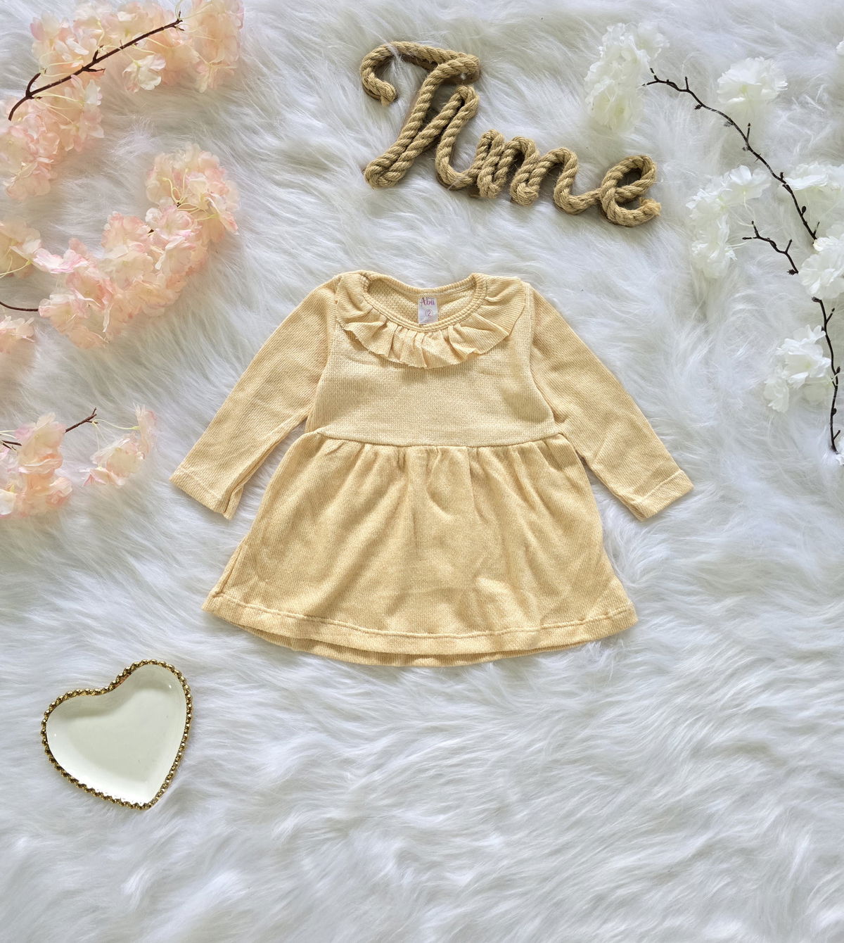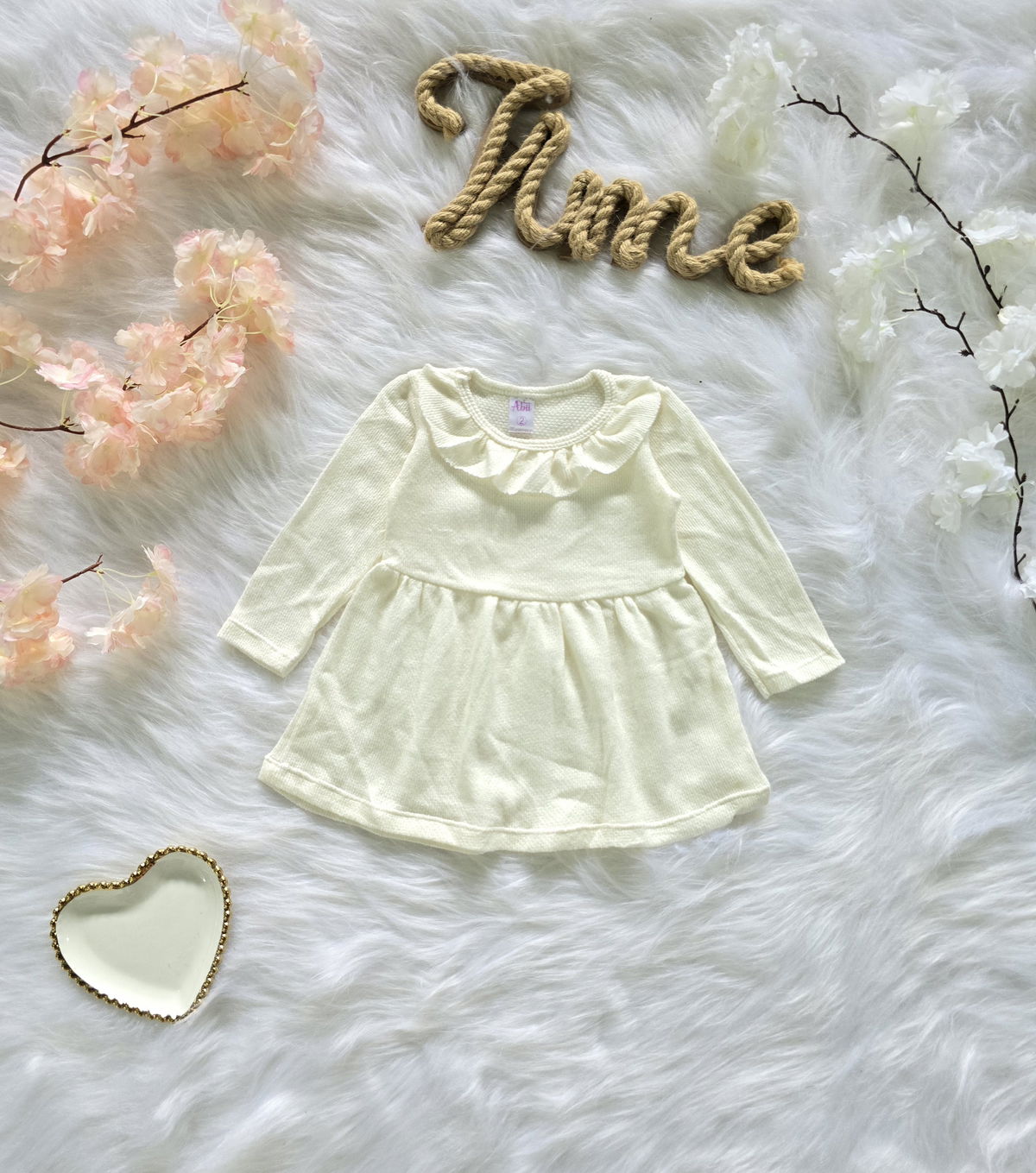 Vestido confeccionado en lanilla wafle, una tela suave, abrigada y con textura delicada, ideal para los días frescos. Su diseño incluye volado en el cuello y corte en la cintura que aporta una caída amplia y cómoda.